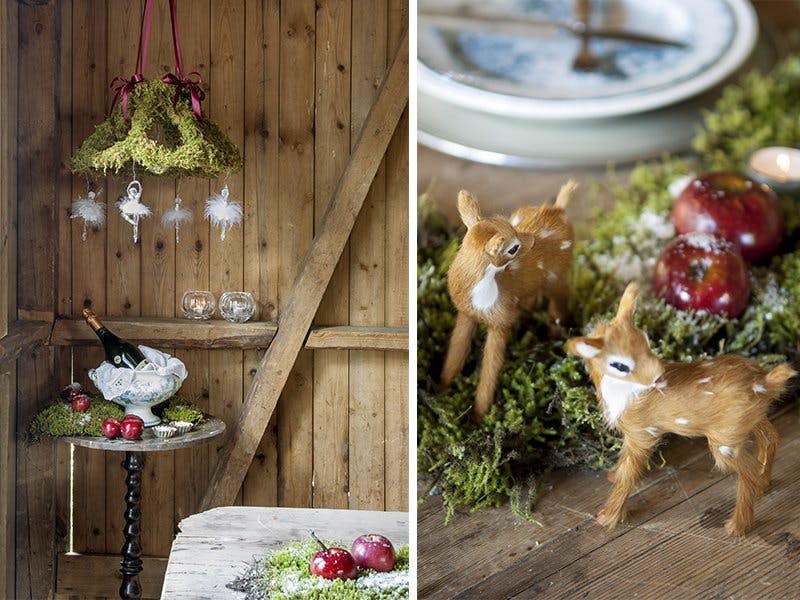 Idé! Lag en liten historie på bordet med mose, rådyr og skinnende røde epler.
