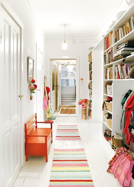 Plass til alt: I gangen er neste alle vegger tatt i bruk til oppbevaring. Hyller fra gulv til tak skaper en varm atmosfære. Det er gjort en original vri ved å ramme inn klesknaggene med bokhyller - men hvorfor ikke? Bruk den plassen du har! En søt benk som også har oppbevaring under setet, er et smart møbel til gangen.