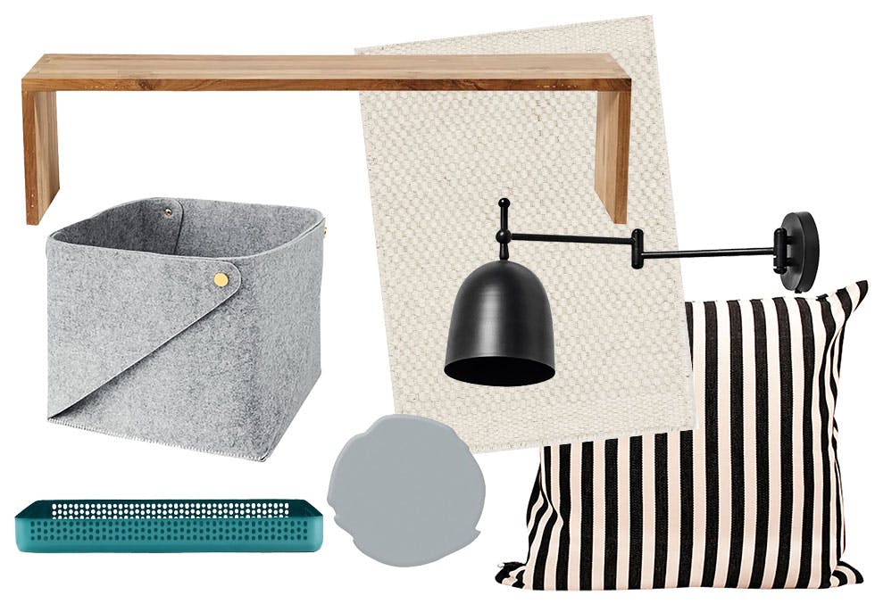 Benk, One, H 45 x B 220 x D 40 cm, 7399 kr, Muubs, gulvteppe, Asko, i ull, 140 x 200 cm, 1659 kr, Linie Design, vegglampe, jern, L 54 x Ø 16 cm, 1629 kr, Nordal, pute, Donia, 50 x 50 cm, 409 kr, Afroart, brett, Nic Nac , i stål, H 4 x L 34 x D 23 cm, 375 kr, Normann Copenhagen, kurv, Pudda, i filt, 28 x 28 x 23 cm, 98 kr, Ikea, veggmaling, Lady Balance, i fargen Soft Teal, 2,7 l, 399 kr, Jotun.