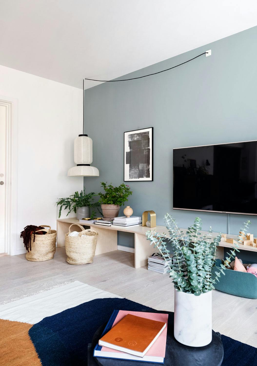 Vi innredet stuen med en benk med oppbevaring og malte veggen i en farge som tar fokuset vekk fra tv-en. Og vips – en stue som er både ryddig og unik!