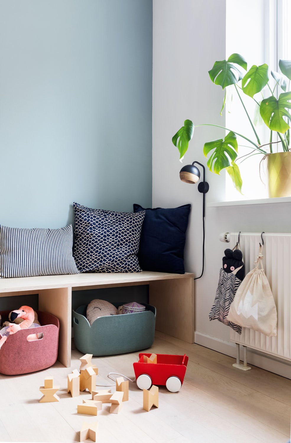 Lag en koselig krok i den ene enden av benken. Myke puter og en liten vegglampe inviterer til lek og kos. En vinduskarm eller en radiator kan utnyttes til å henge opp fine tøyposer i små kroker.
