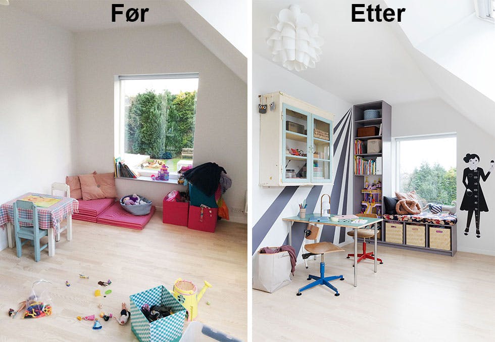 Før & etter Nytt favorittrom til gjester og lek Familien brukte knapt rommet før vi pusset det opp. Med en skreddersydd oppbevaringsbenk utnyttet vi plassen maksimalt og ga dem et nytt favorittrom til gjester, lek og kos.