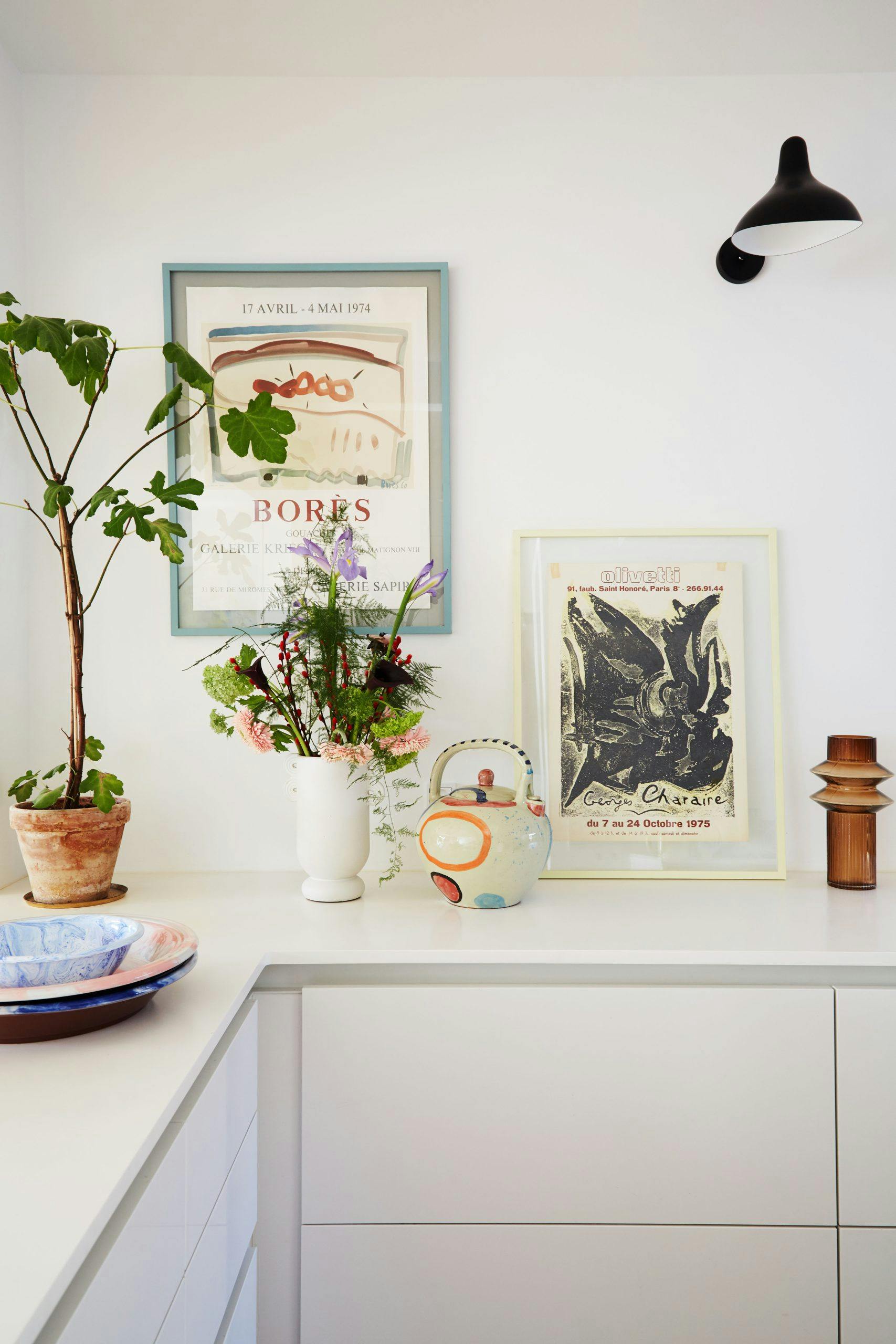 2. Utnytt plassen mellom malerier og plakater til et relieff eller annen veggdekor. Det gir bildeveggen en levende, tredimensjonal effekt. Og husk at det som står fremme på hyller og bord også blir en del av det samlede uttrykket.