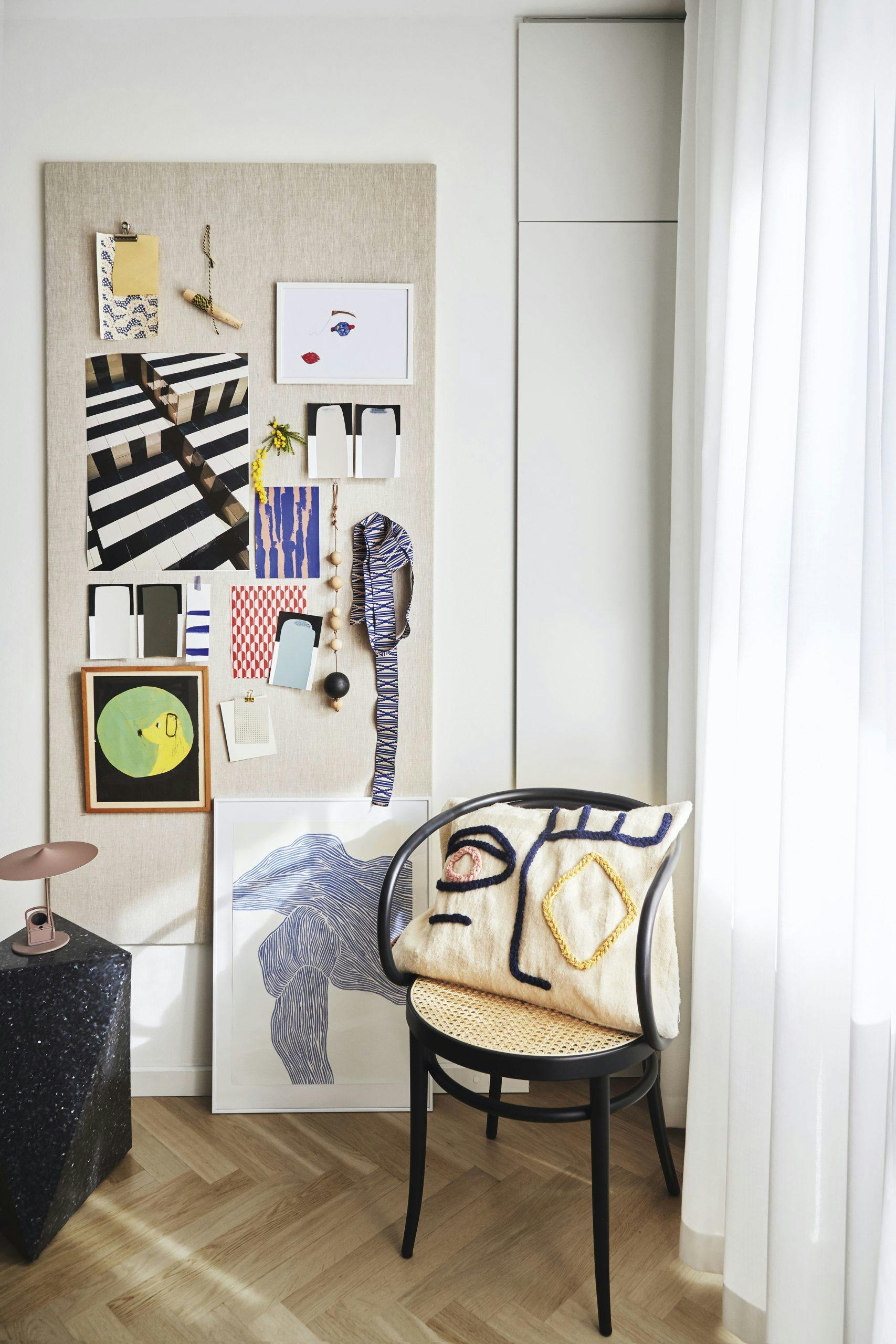 4. Lag et fleksibelt kunstverk med ting som opptar deg akkurat nå. Bruk en nøytral oppslagstavle, en snor med små klyper eller ta hele veggen i bruk. Sett sammen farger du elsker og materialer som inspirerer deg, og skift ut tingene når du faller for noe nytt.