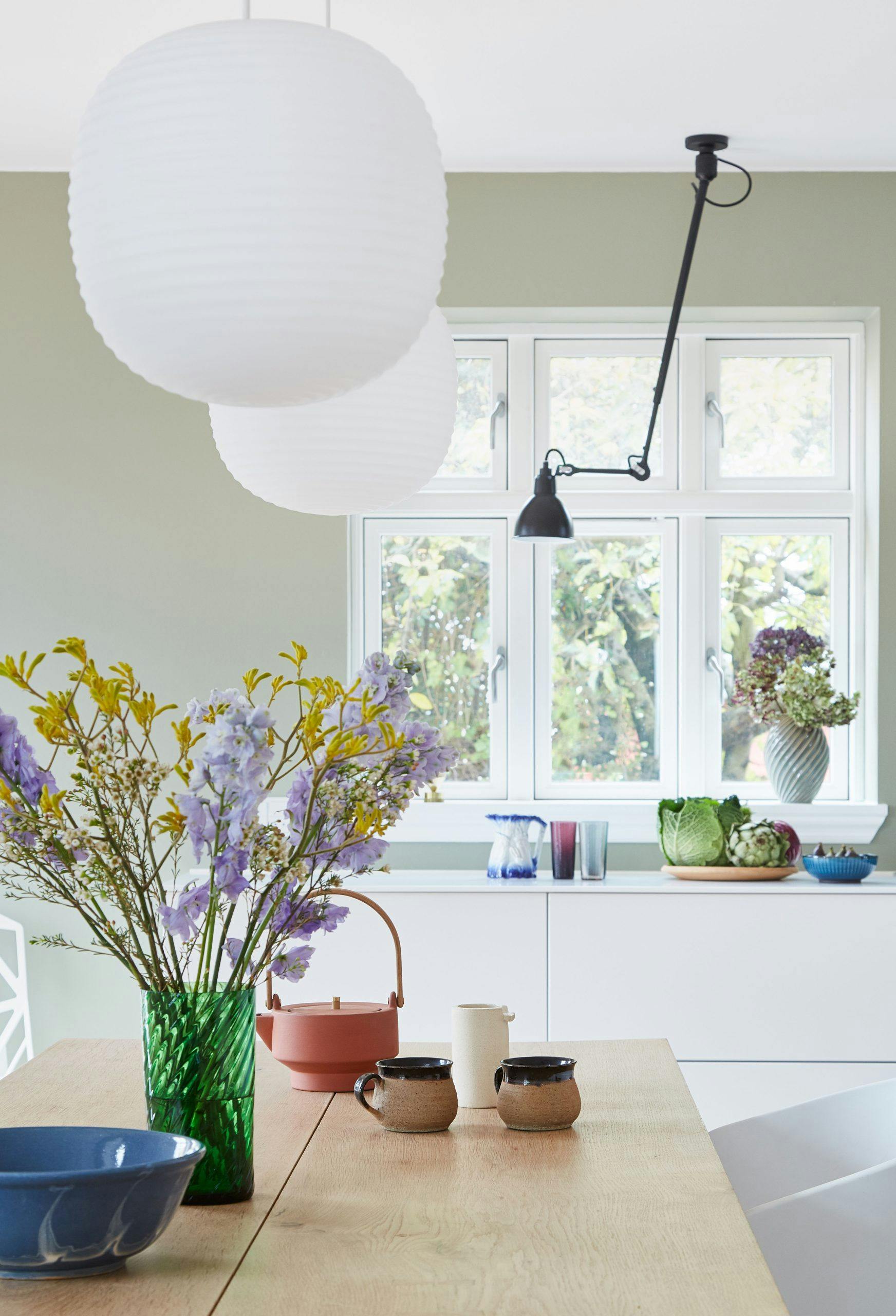 4. Godt arbeidslys er et must i kjøkkenet. Velger du en fleksibel modell kan du justere lyset etter behov. 5. En skulpturell lampe gir innredningen masse karakter og er med på å understreke stilen din. Hvis lampen skal henge høyt er det smart å tenke på at selve lyskilden bør være skjermet slik at du ikke blir blendet.