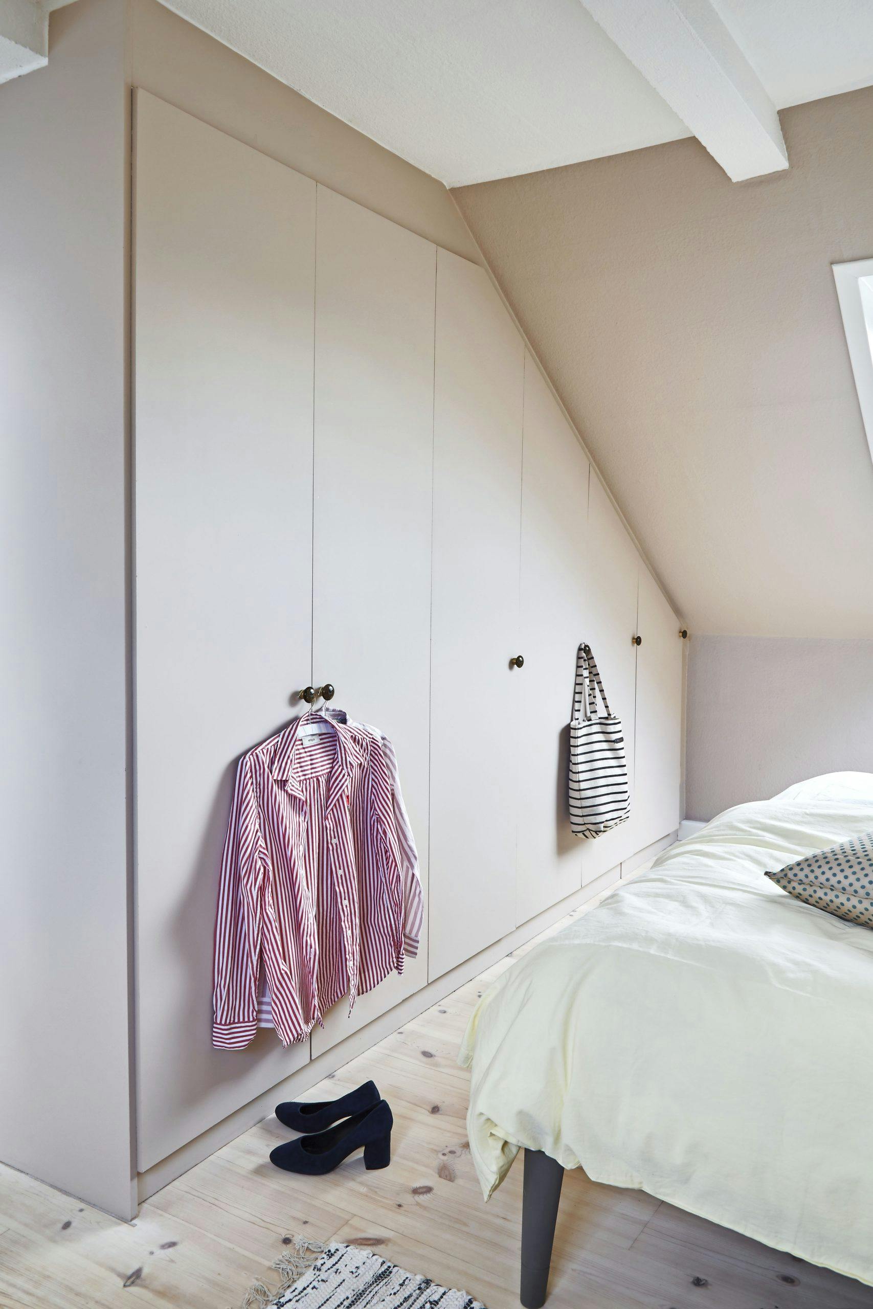 2. Skråtak er alltid en utfordring, og her kan en skreddersydd løsning virkelig optimalisere plassbruken. Du kan kutte til skapmoduler fra f.eks. Ikea slik at de passer høyden og vinkelen på skråtaket. Maler du det hele i samme farge som veggene, blir den integrerte løsningen komplett.