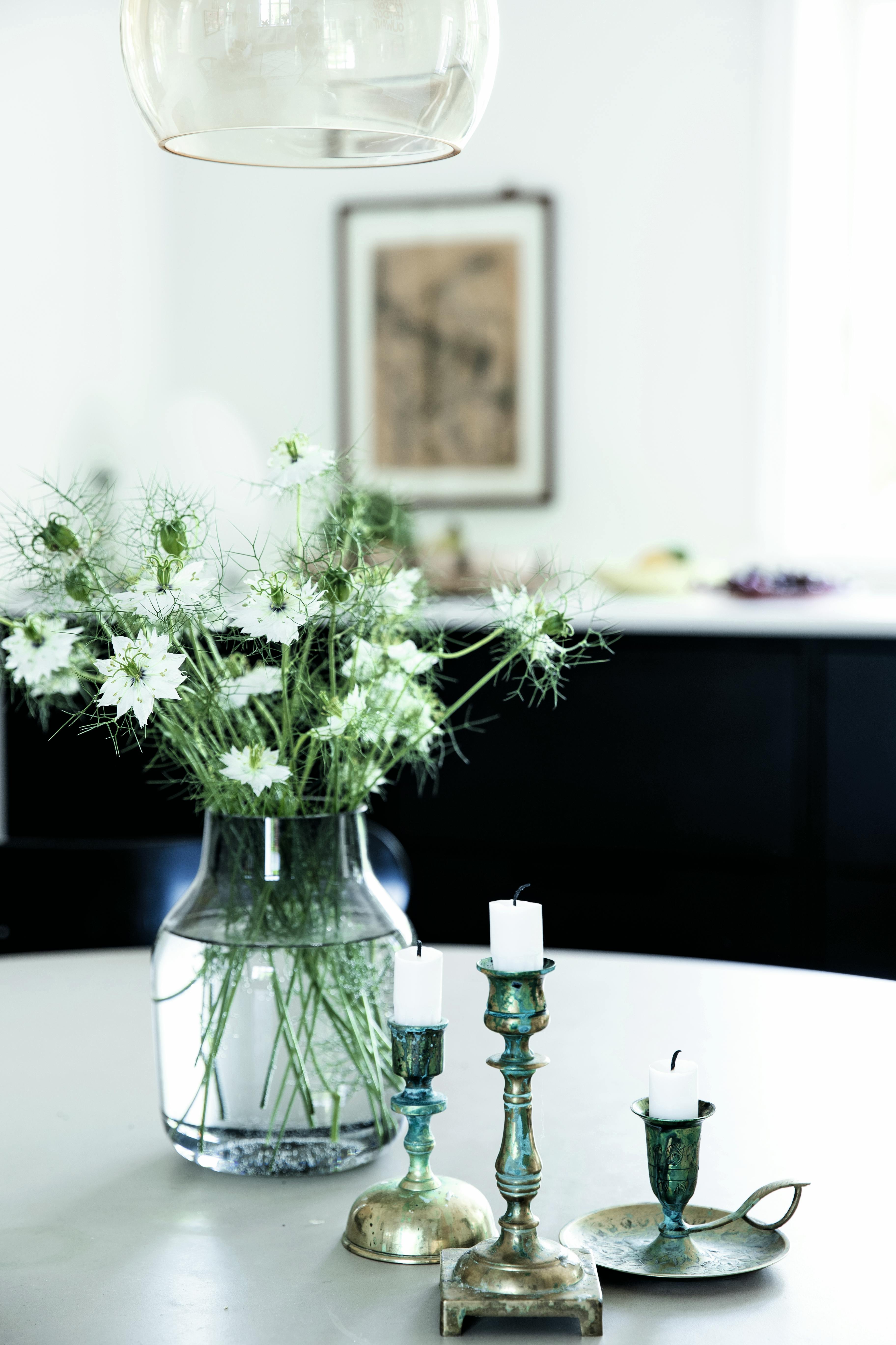 Kjøkkenet i svartbeiset eik er lagd av en møbelsnekker. Det har et rolig uttrykk som gir plass til kunst og blomster. Spisebordet er designet av Arne Jacobsen og kjøpt på auksjon. Stine har lagt møbellinoleum på bordplaten. Stolene er også designet av Arne Jacobsen.
