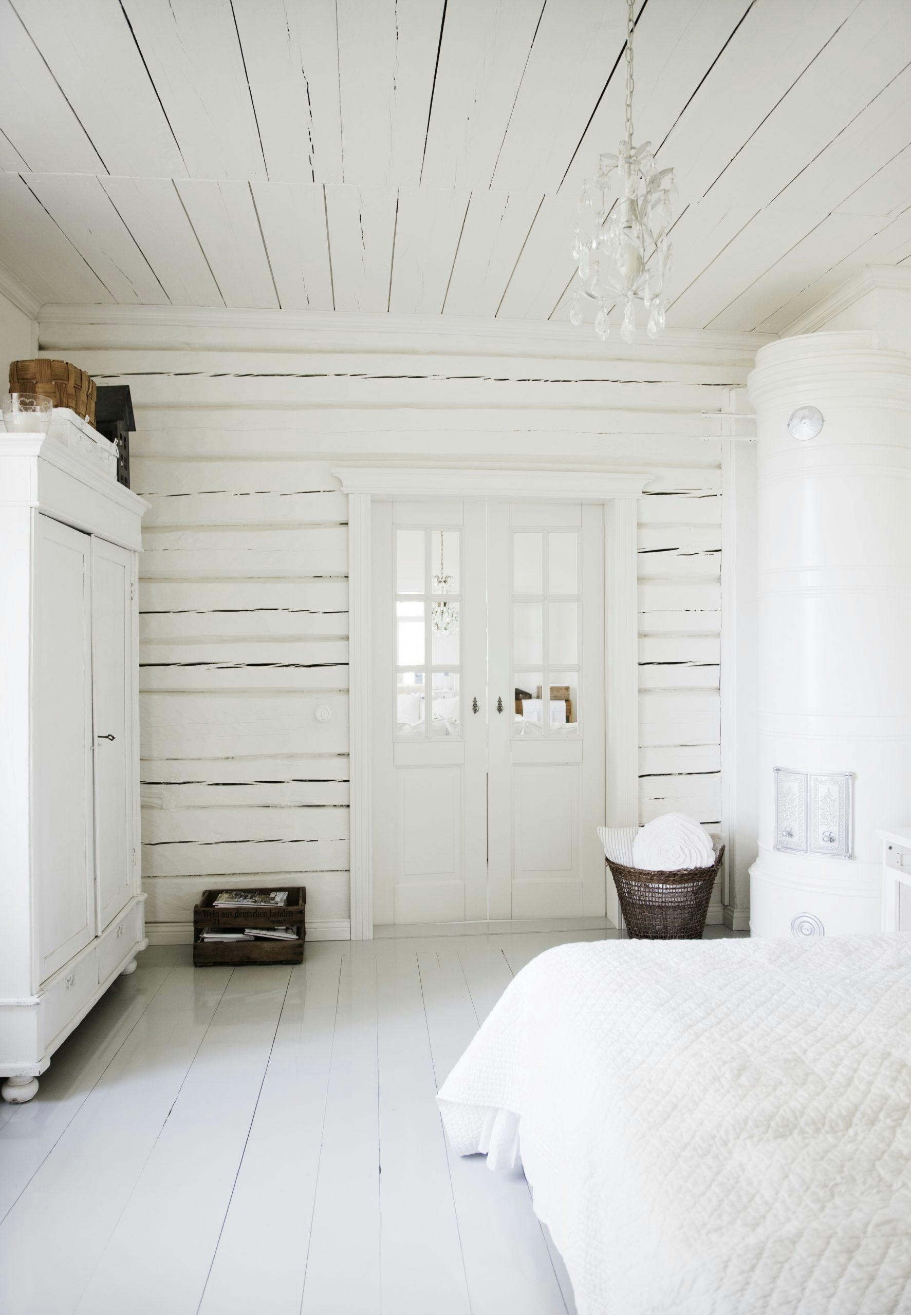 Kakkelovnen er hvitmalt, og de gamle treveggene like så. Sirpa ønsket å bevare mye av sjelen i huset, noe som innebar å blant annet å vise frem de sprukne veggene som gjemte seg bak sponplater og tapet.