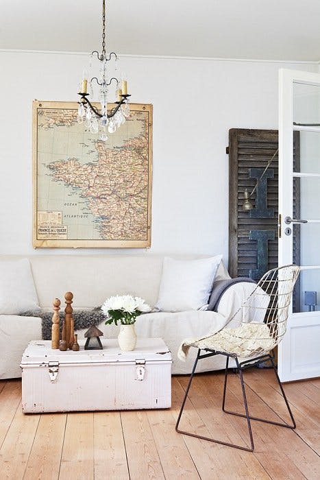 Den hvitmalte stuen er lys og luftig. Som sofabord er det brukt en gammel, hvitmalt koffert. Over sofaen henger en gammel skoleplansje. Vindusskoddene er kjøpt i Frankrike.