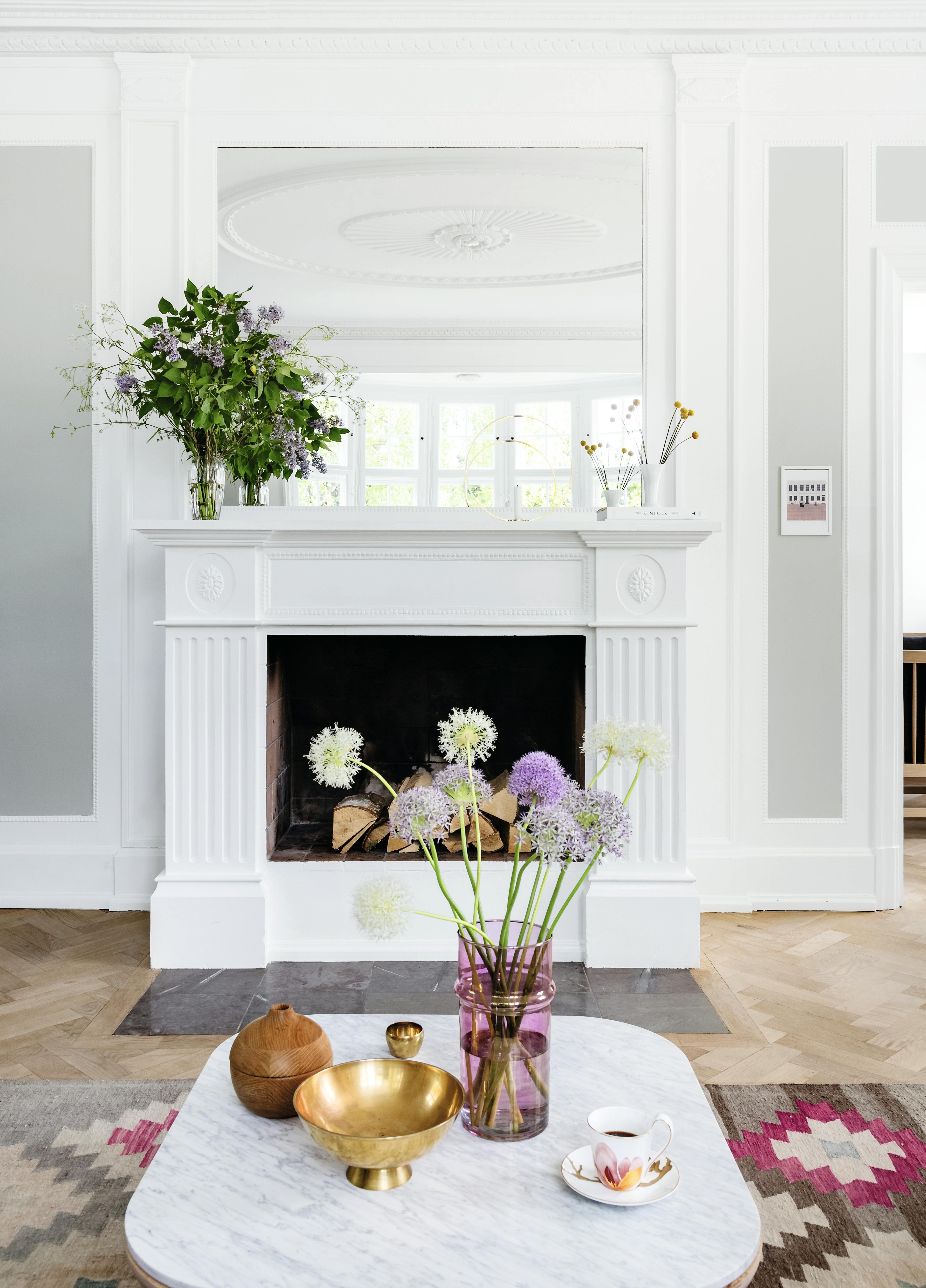 På den originale radiatorskjuleren står en messingskål fra Nordstjerne, vase fra Lyngby Porcelæn og Murano-skål fra Ruby Atelier. Bildet er fra Stilleben