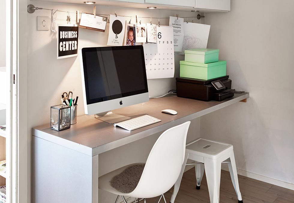 Utnytt plassen maksimalt i en gang eller korridor, og lag et funksjonelt hjemmekontor langs den ene veggen.