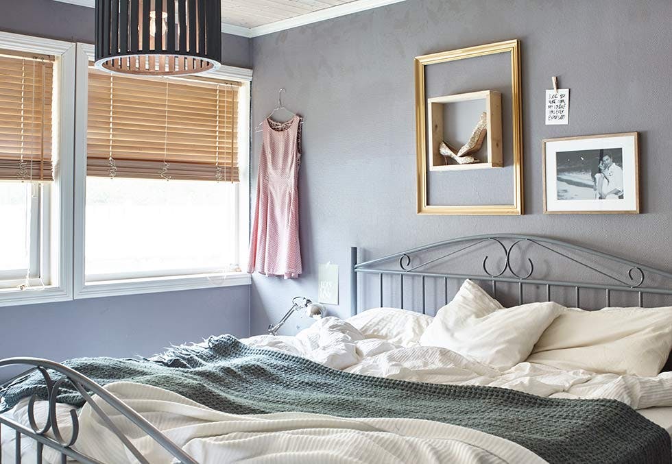 Personlige detaljer gjør soverommet til Mariell og Jimmy hjemmekoselig. Sengen har hun arvet og rullegardinene er fra Ikea. Brueskoene fra Jimmy Choo har hun satt i en hjemmelaget ramme over sengen.