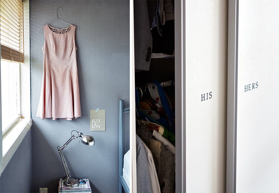 På Mariells side av sengen henger et feminint innslag i form av en kjole. En bunke med inteiørmagasiner fungerer utmerket som nattbord.