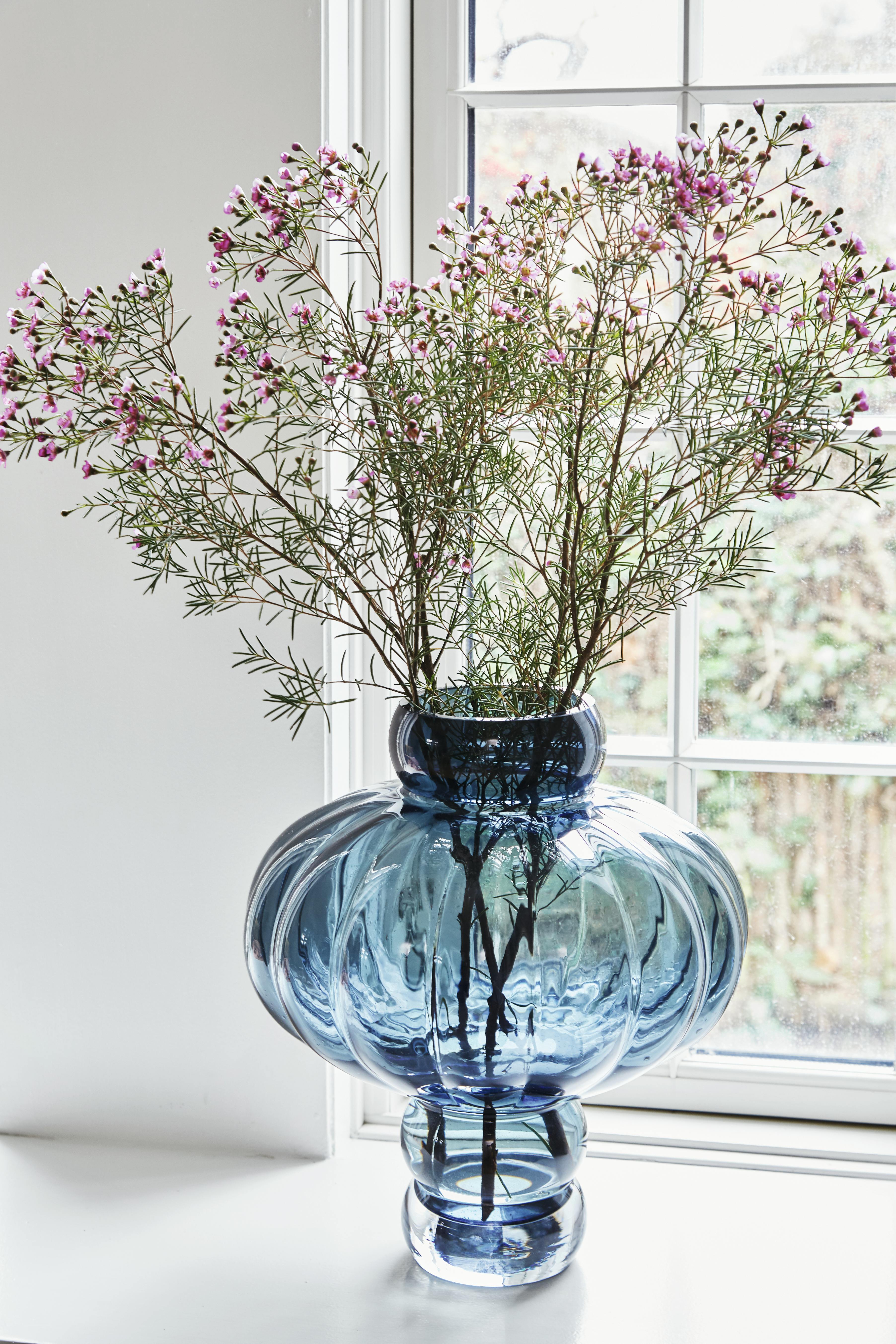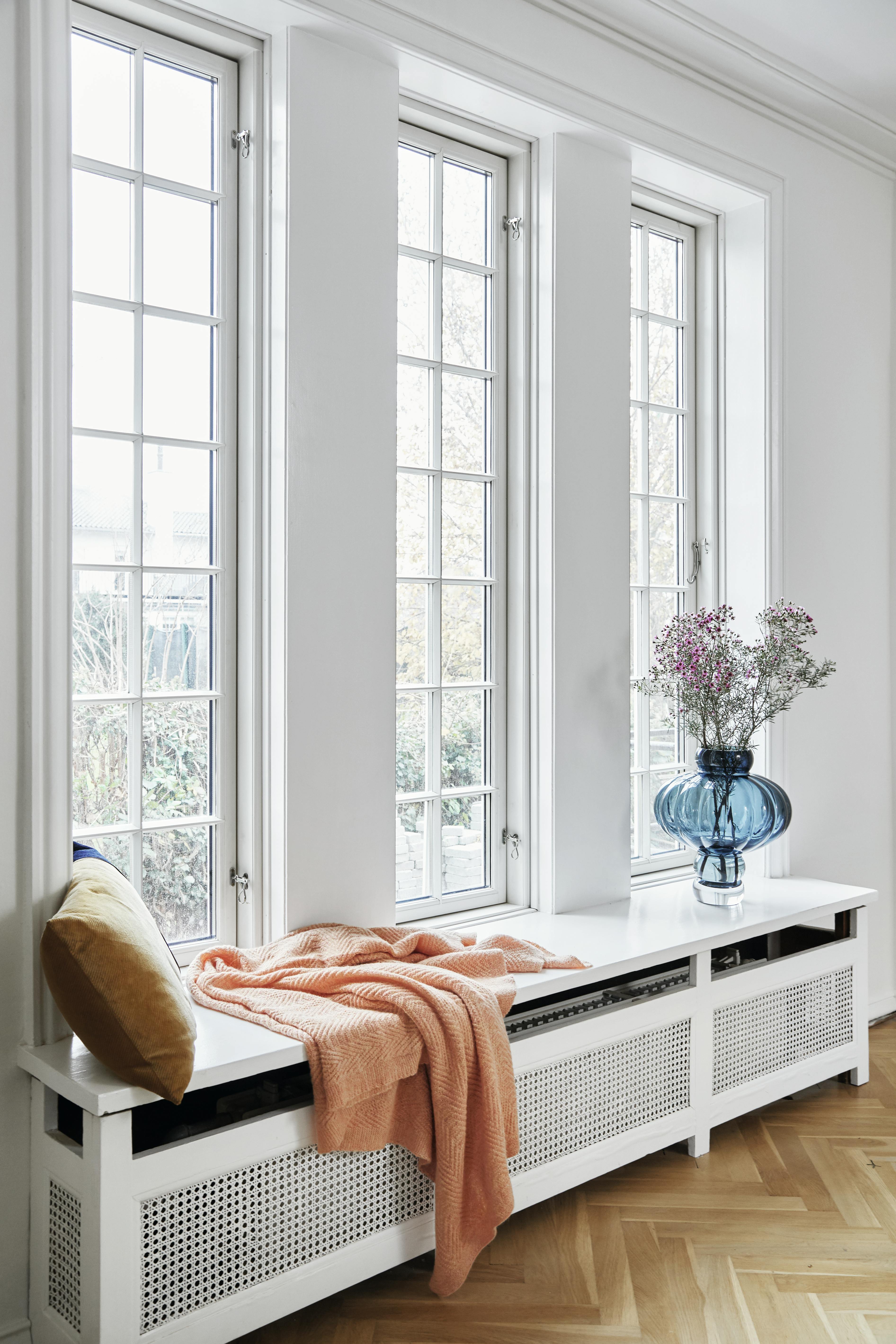 Friske blomster i en glassvase fra Louise Roe gir et lett og luftig uttrykk i vinduskarmen.