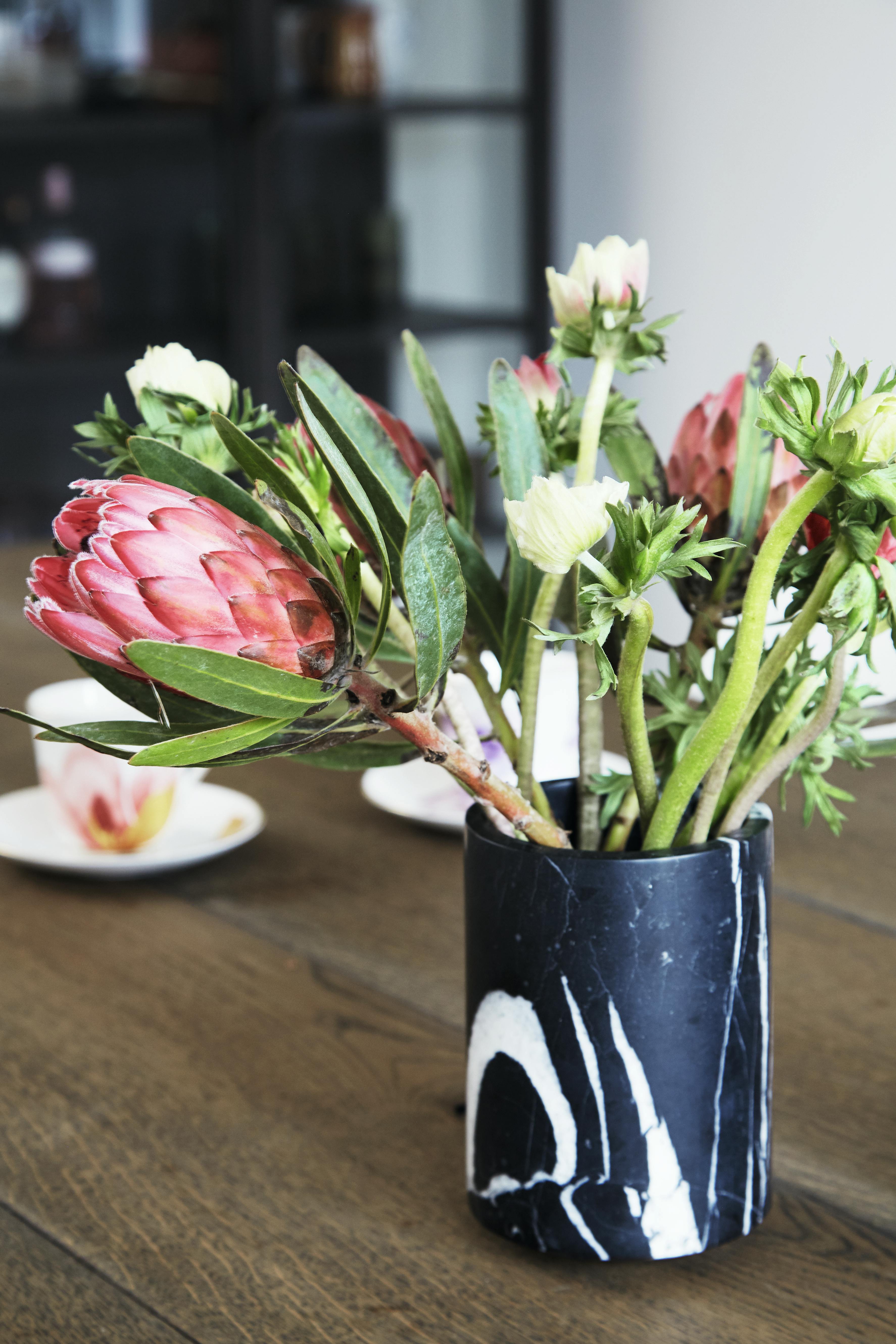 Den svarte marmorvasen fra Louise Roe på spisebordet matcher benkeplaten i samme materiale.