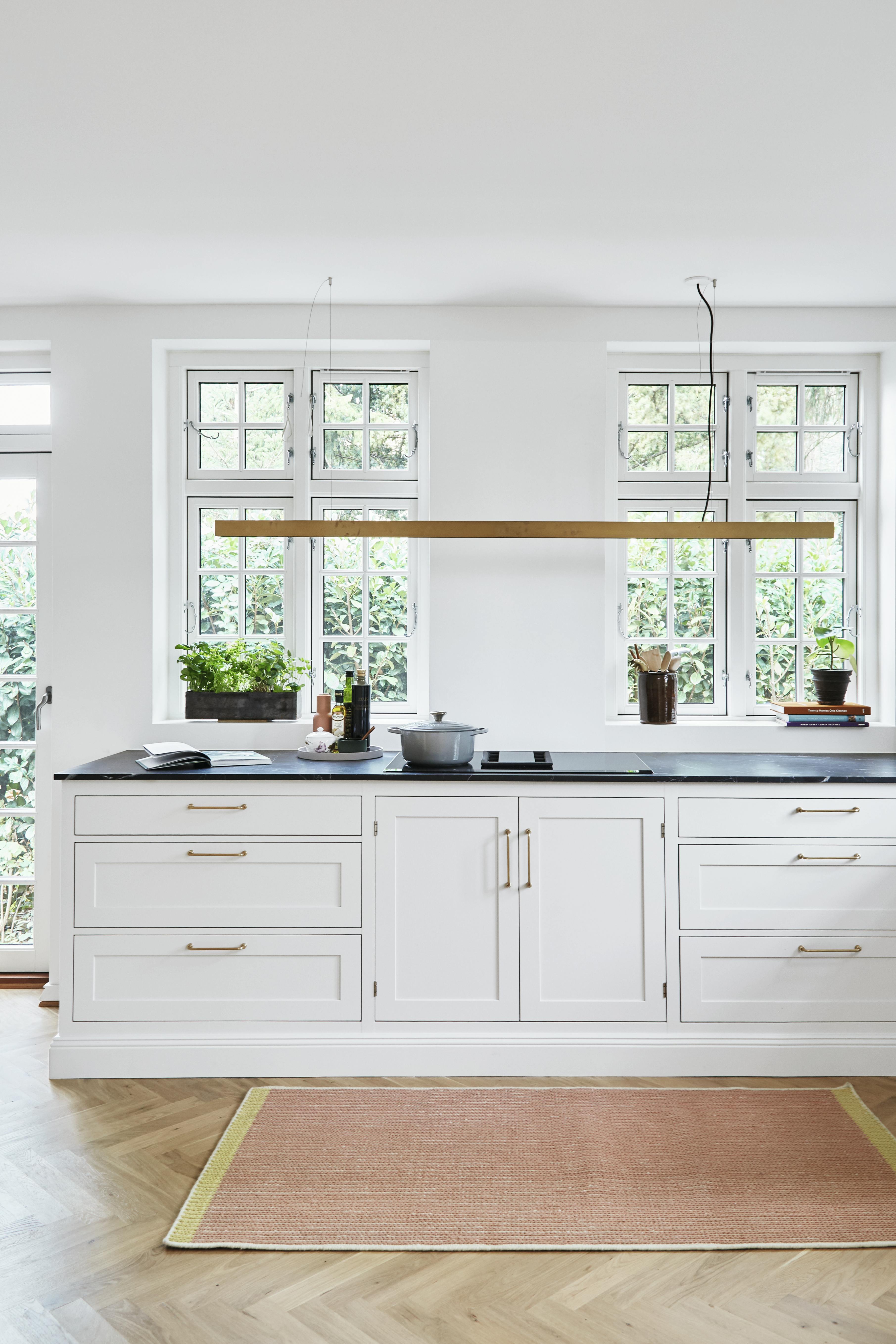 BILDE For å integrere påbygget best mulig, valgte paret kjøkkenvinduer med samme type sprosser som i de originale vinduene i spisestuen. Gulvteppet er fra Louise Roe.