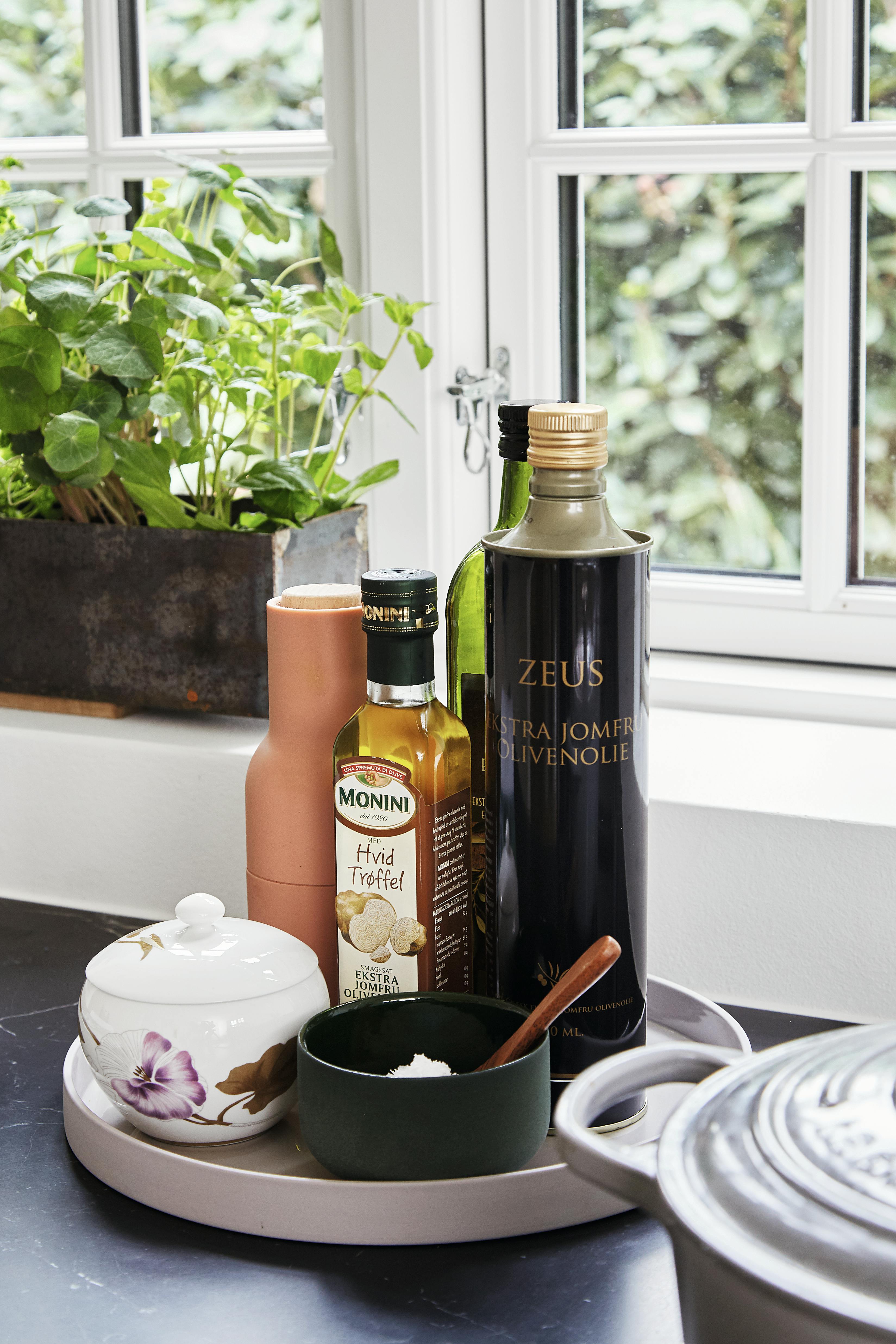 Friske krydderurter i vinduskarmen og en samling med gode oljer og krydder på et fat fra Menu.