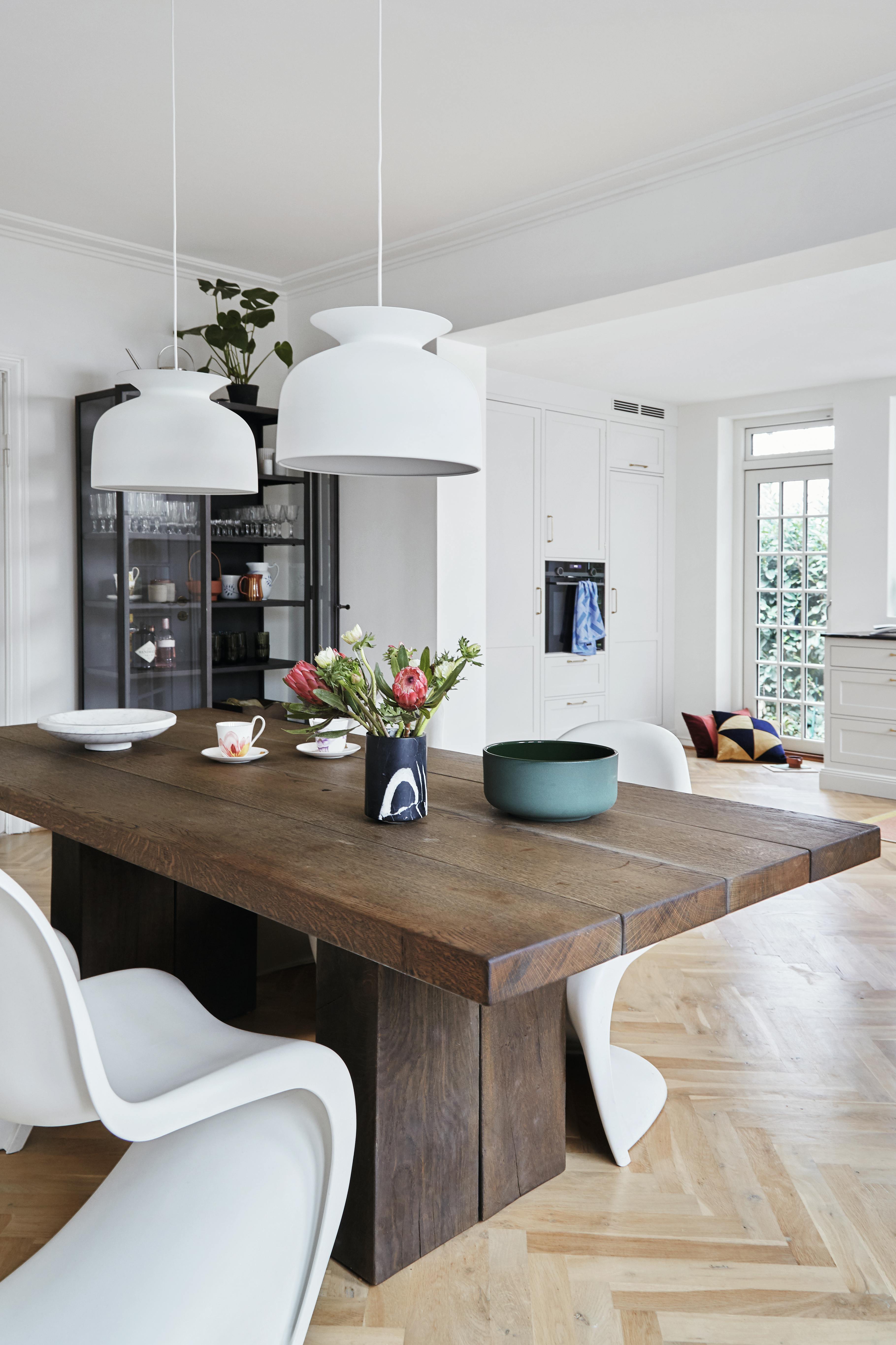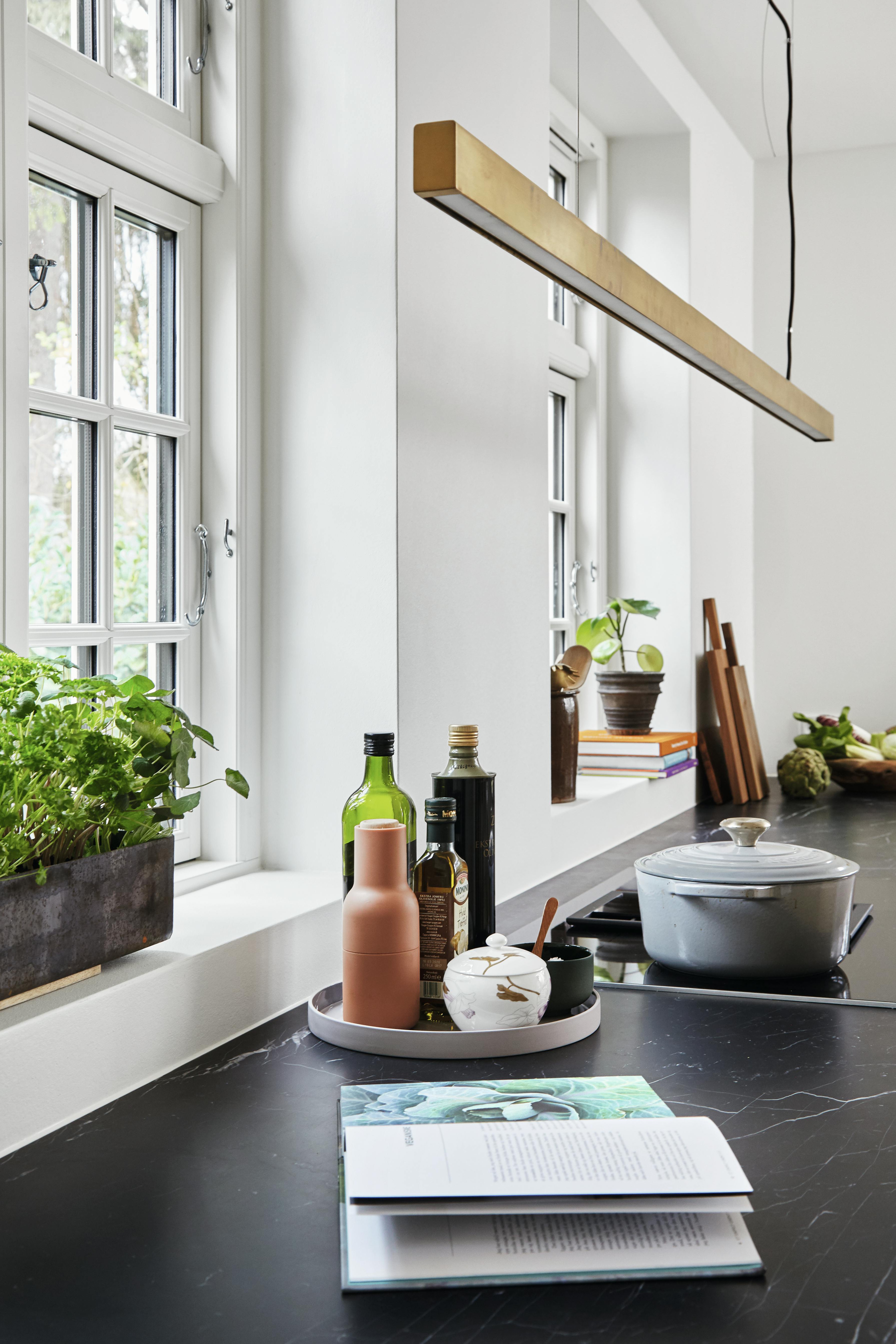 Kjøkkenets klassiske stil får en moderne vri med en nærmest svevende lampe fra Anour.