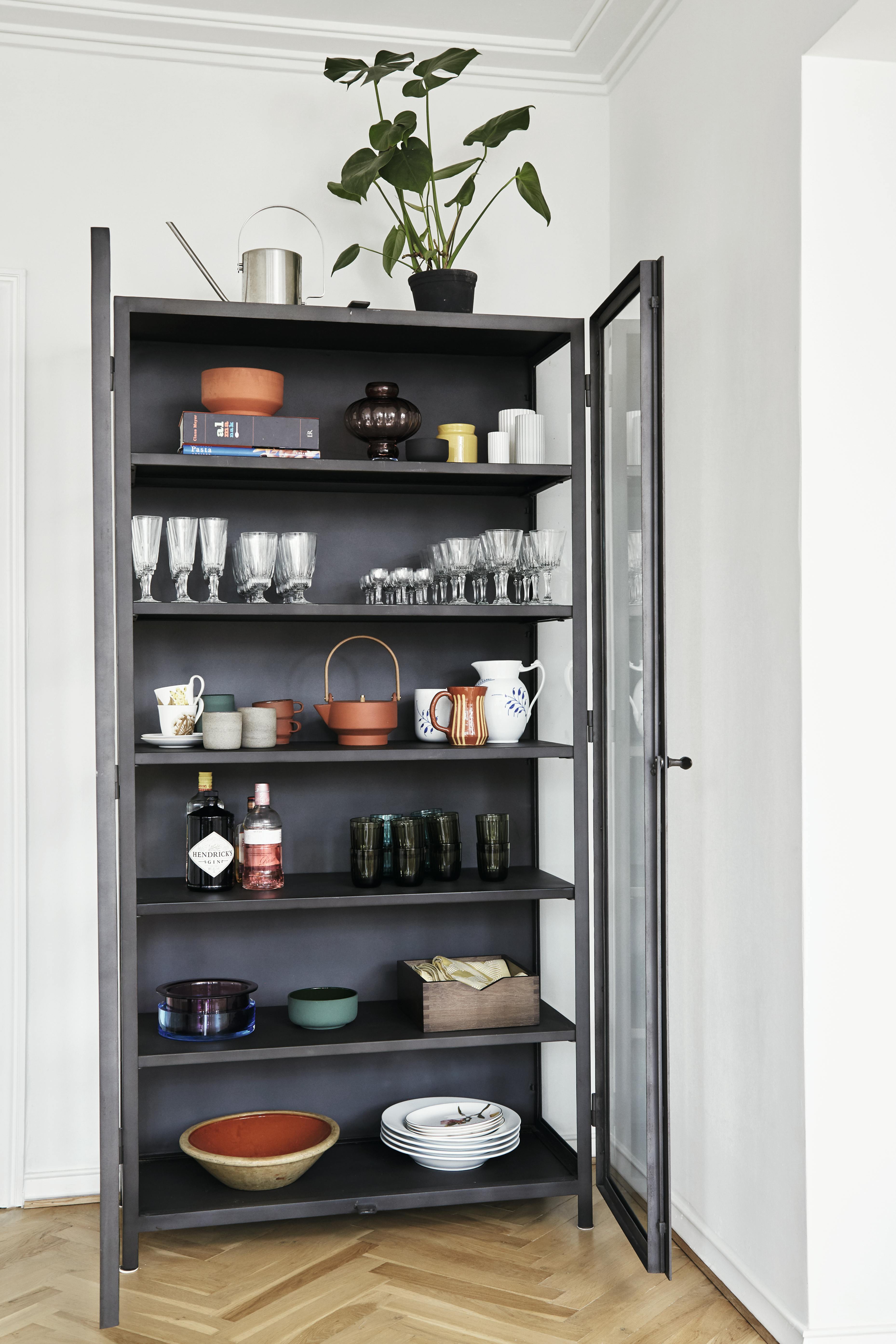 Husets herskapelige stil får en moderne kontrast med vitrineskapet i jern fra Muubs.