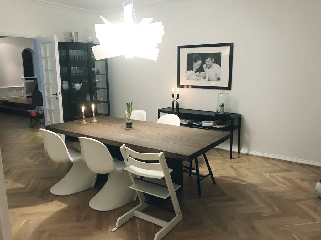 Da Mia og Olov så huset første gang, falt de pladask for den lekre fiskebensparketten, og valgte å legge samme gulv i påbygget.