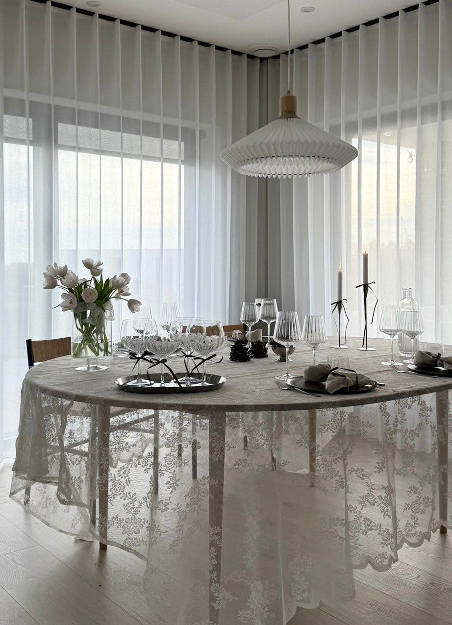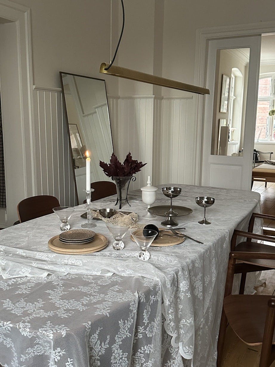 Hvis spisebordet ditt er av den større typen, kan du fint bruke begge gardinene og leke med hvordan de overlapper hverandre. La dem for eksempel danne en bred løper i midten, eller la dem krølle seg for et uperfekt uttrykk, slik Ann-Sophie har gjort.