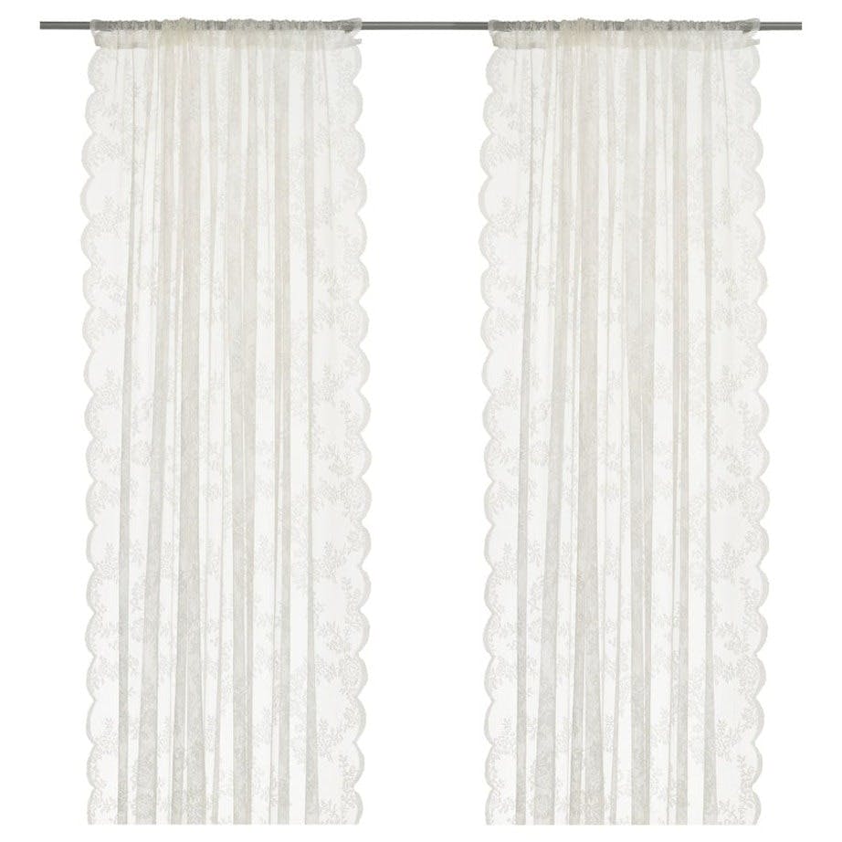 Gardinene heter 'Alvine Spets', er laget av blonde og kan kjøpes for den nette sum av 149 kroner – for et sett med to, vel å merke. Og da gjør det jo ikke så mye om den får et par rødvinsflekker i løpet av kvelden.