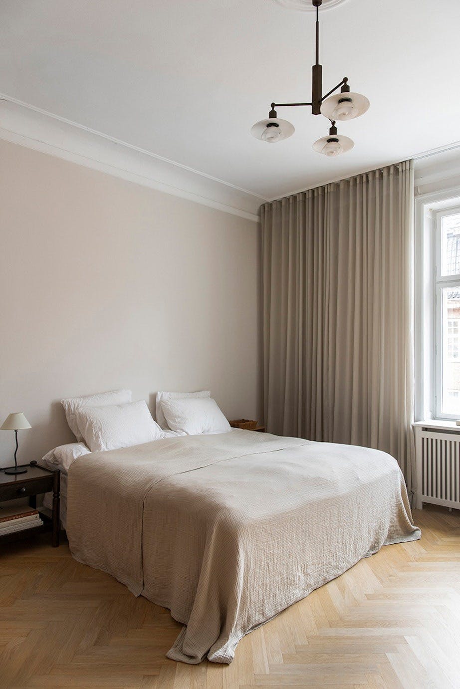 Paret har en innredningsmantra: Rene linjer skaper visuell ro. Det gjelder også på soverommet deres, som er innredet med en seng fra Jysk, en pendel fra Louis Poulsen, og et sengeteppe fra Ferm Living. Både nattbordet og bordlampen er loppefunn.
