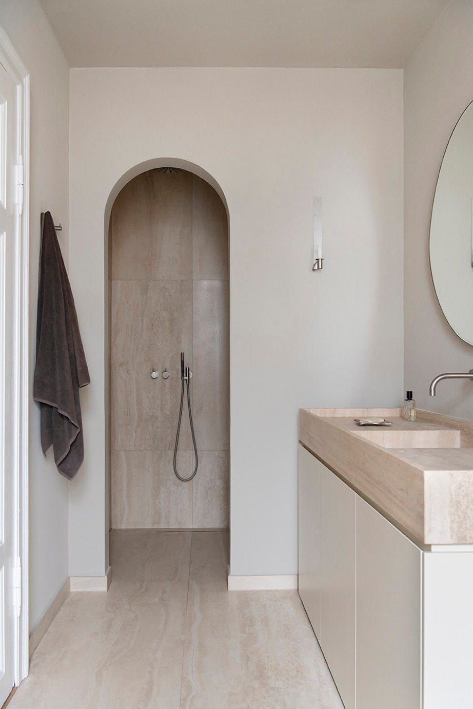På det nye badet er plasseringen av servant og toale! endret, og det er bygd en lekker, buet åpning inn til dusjnisjen for å matche den herskapelige stilen i resten av leiligheten.