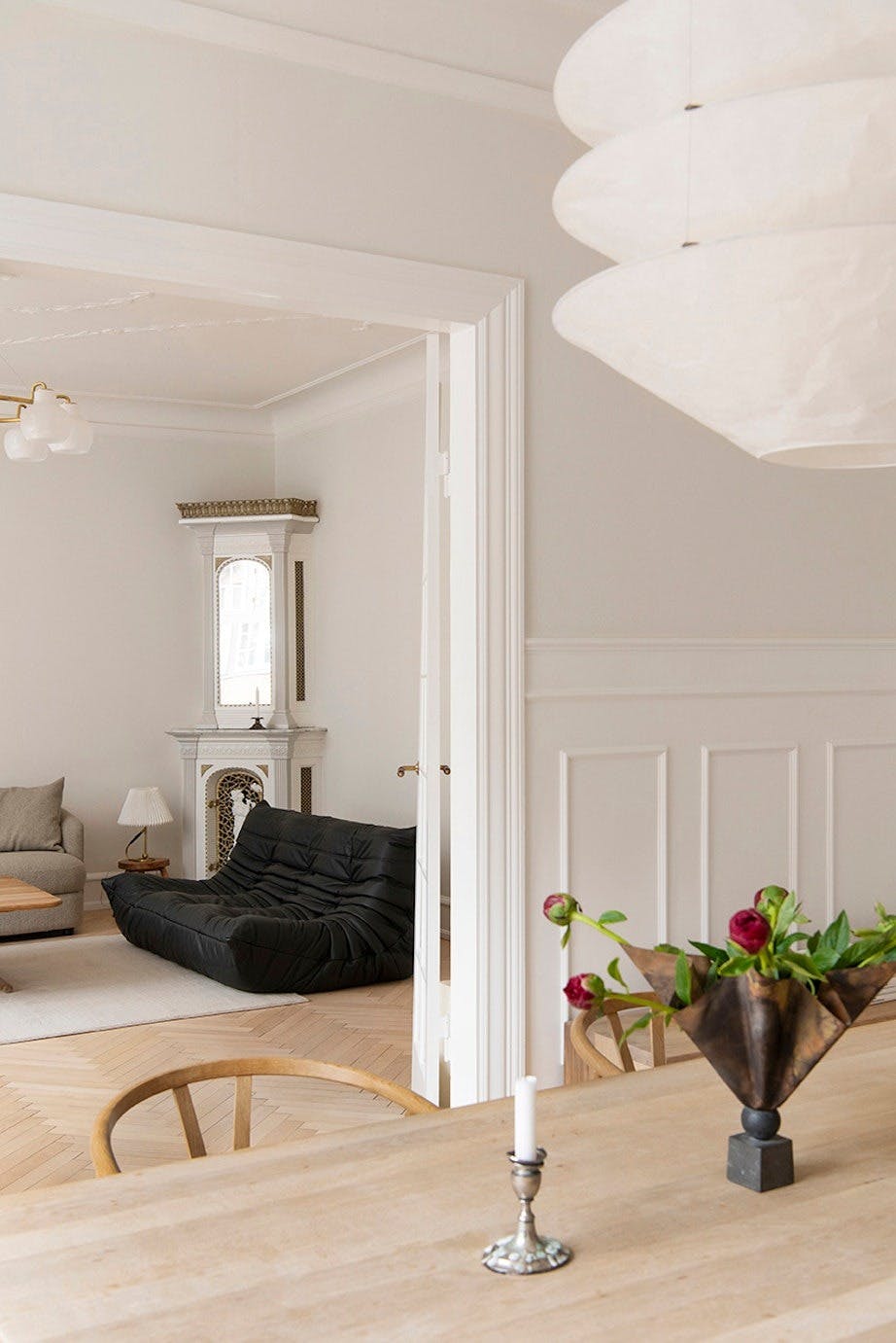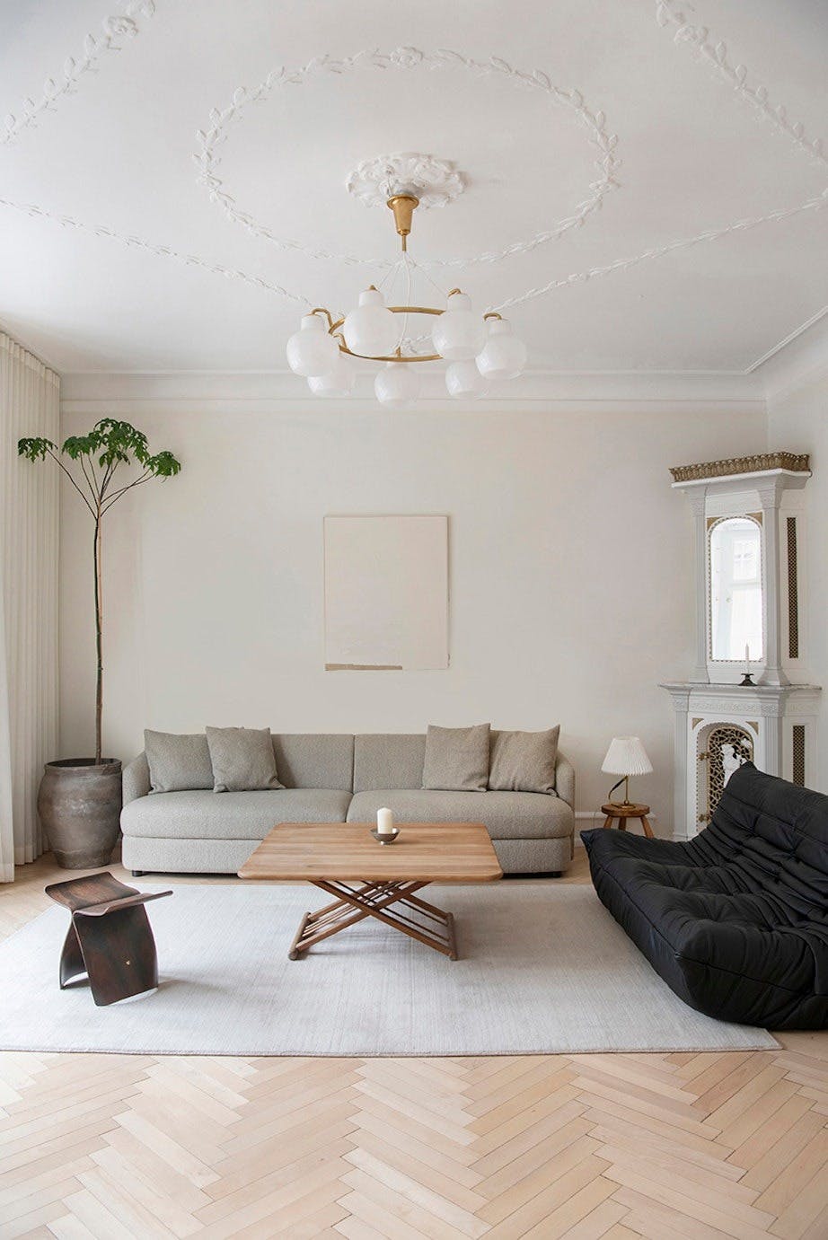 I stuen står det en vakker, gammel kamin som paret har fått reparert. Den svarte Togo-sofaen fra Ligne Roset bryter med den lyse fargepaletten som dominerer i leiligheten. Bordlampen er fra Le Klint.