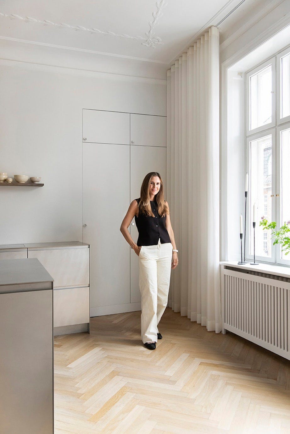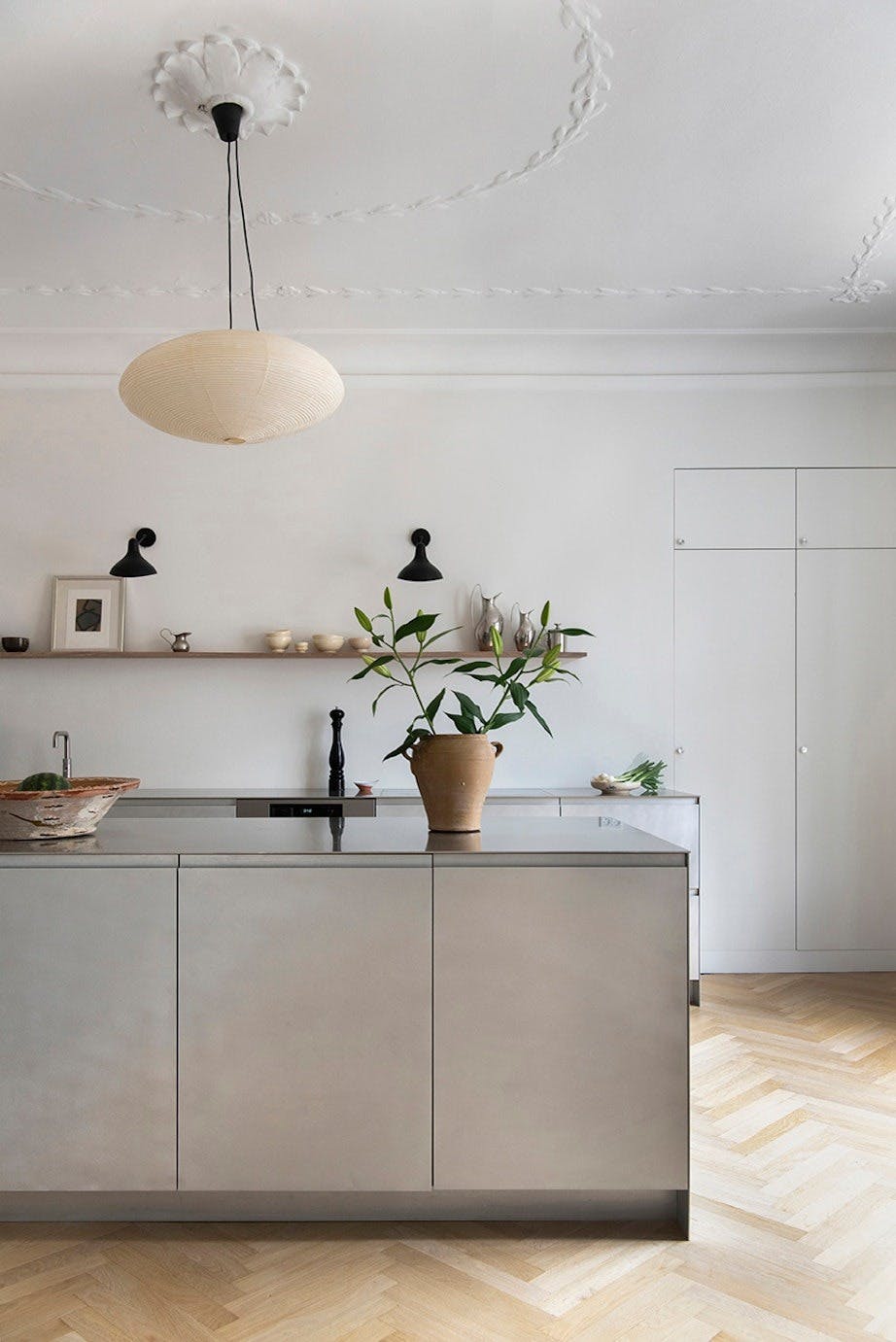 Stålkjøkkenet fra Reform er en lekker kontrast til den romantiske stukkaturen, brystningspanelet og den originale sildebensparketten. Skålen og vasen på kjøkkenøya er vintagefunn fra Spania.