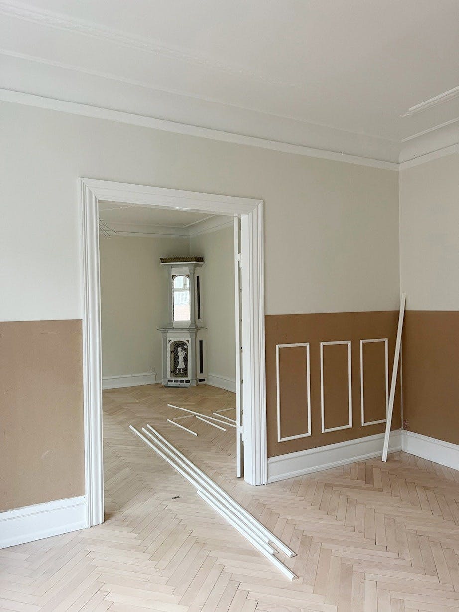 – Det viktigste for oss var at oppussingen skulle skje med respekt for leilighetens opprinnelige detaljer og den helt særegne atmosfæren, sier Emilie. Blant annet valgte de å gjenskape en av stuene som var blitt delt opp av de forrige eierne.