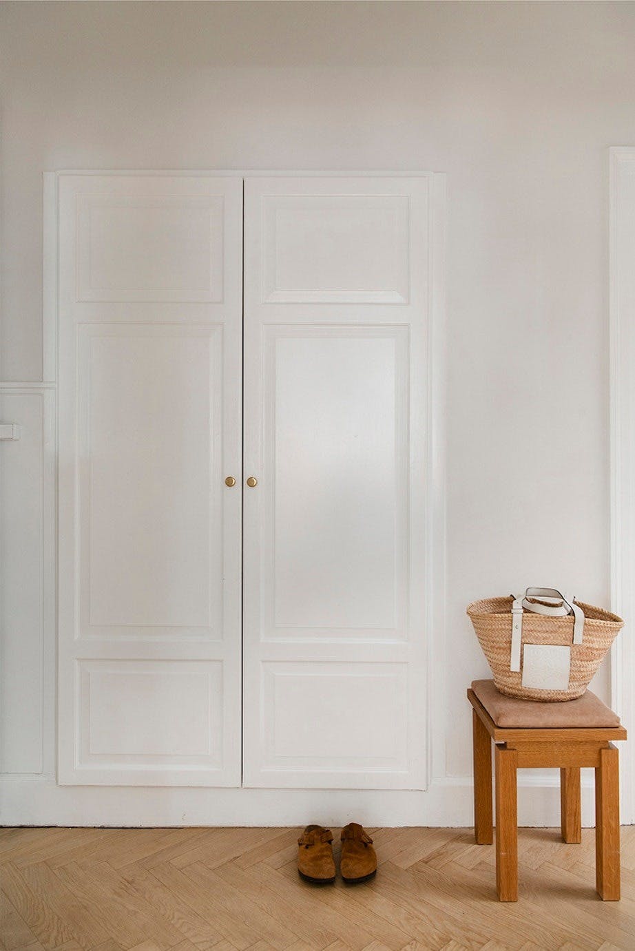 Gangen er helt enkel, men paret har fått lagd nye dører til det innebygde garderobeskapet hos en snekker. Den lille, praktisk krakken fra Dinesen tilfører rommet varme.