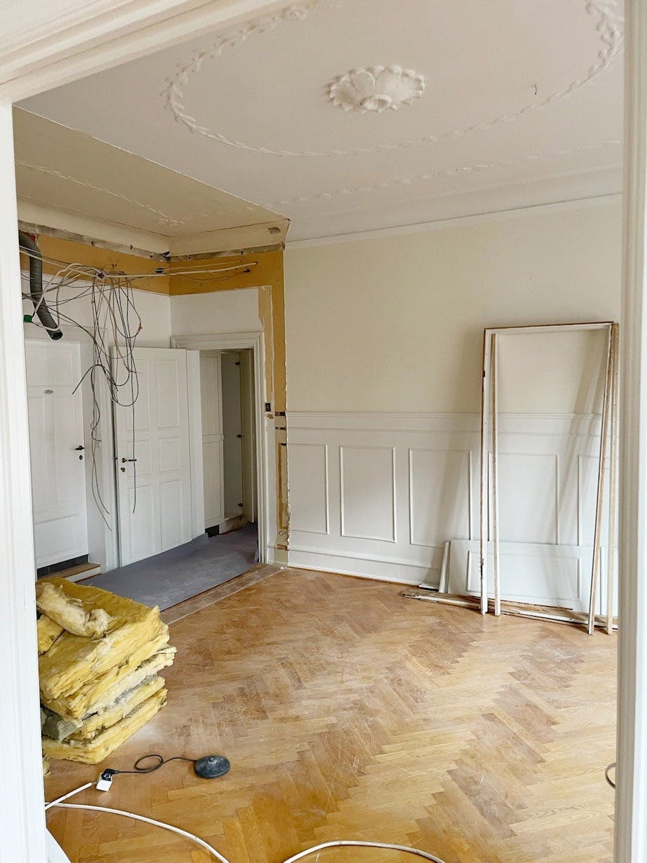 – En vegg ble "ernet for å få rommet tilbake slik det opprinnelig var, og vi krysset fingrene for at den gamle stukkaturen lå skjult under den senkede himlingen, og den var heldigvis intakt, forteller Emilie.