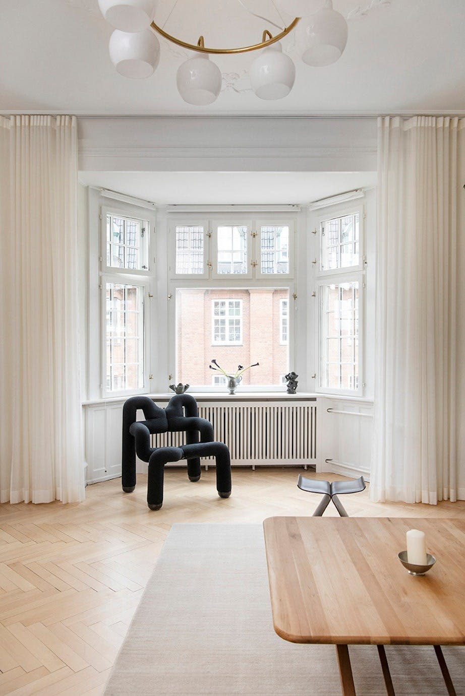 – Har du et nøytralt utgangspunkt, kan du skape liv med kunst, møbler og tilbehør. Gå for holdbare løsninger som du ikke blir lei av, og unngå for mange impulskjøp basert på flyktige trender. Gardinene foran karnappet kan trekkes for og gjøre den store stuen mer intim. Gardinene er fra Arne Axel og den skulpturelle stolen kommer fra Varier Furniture.