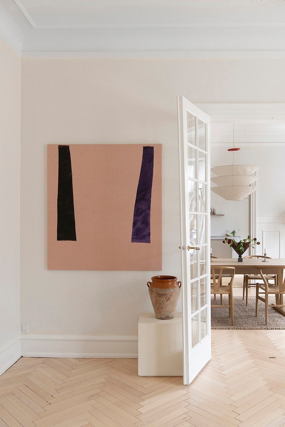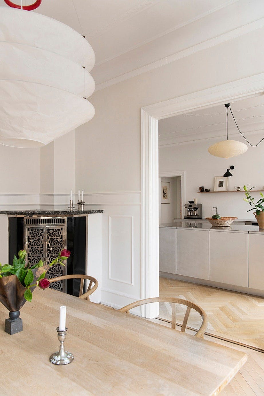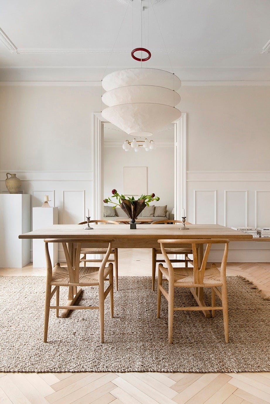 Fra kjøkkenet ser man inn til de vakre stuene. Pendelen er designet av Ingo Maurer, spisebordet av Børge Mogensen og stolene av Wegner, mens lysestakene på bordet er arvegods, vasen fra Tage Andersen og gulvteppet fra Linie Design.