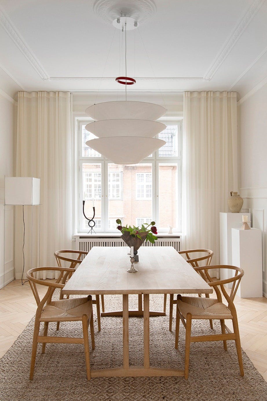 De latte gardinene og lampene i papir understreker den luftige følelsen i spisestuen. Gulvlampen er fra Hollands Licht, mens lysestaken i vinduet er vintage.