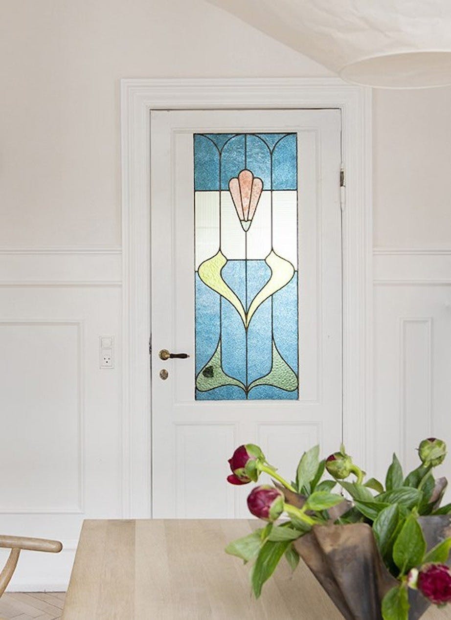 Døren med blyglassvinduet satt opprinnelig i en vegg som ble revet, og paret valgte å flytte den inn til spisestuen.