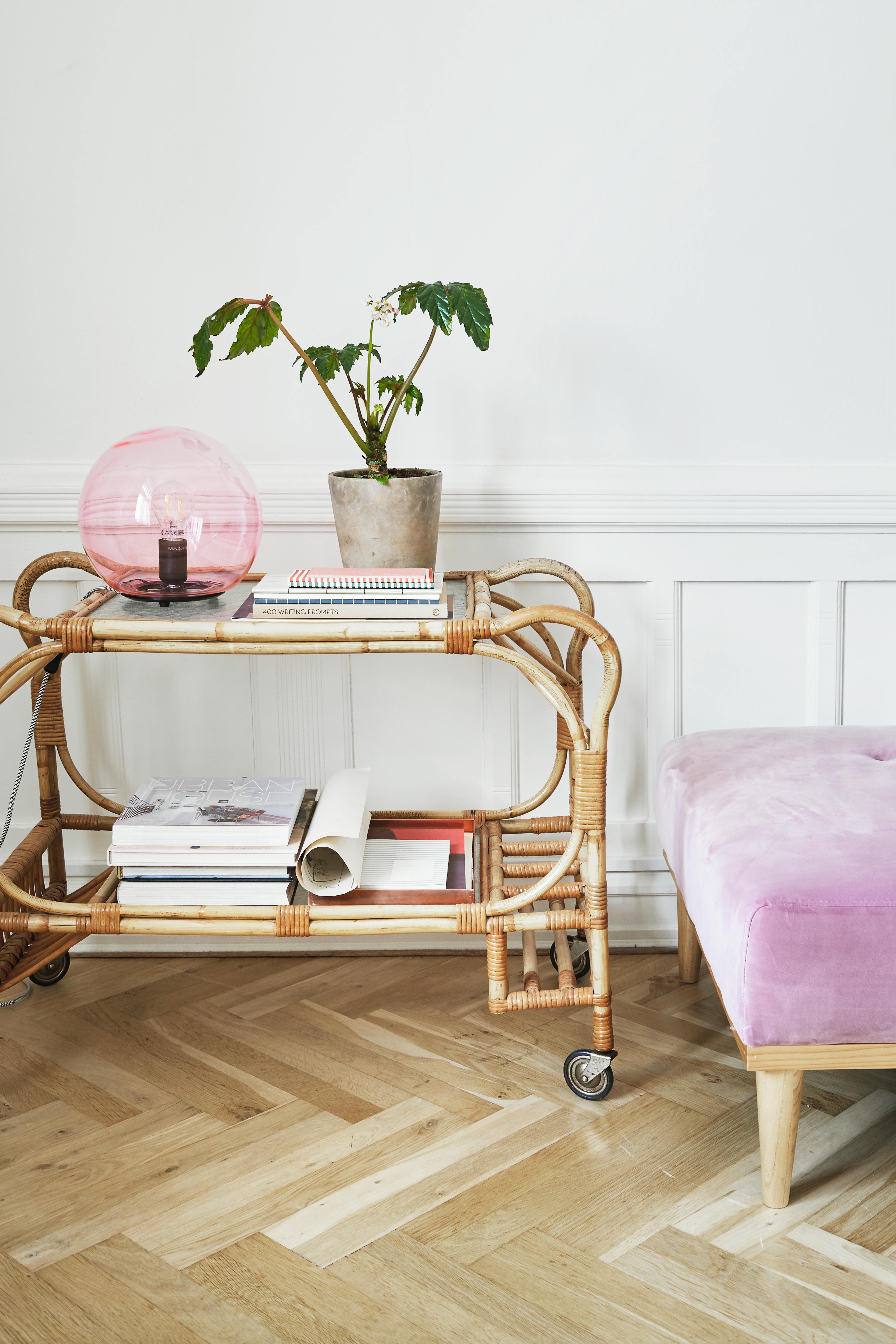 Rottingbordet er funnet i en bruktbutikk, mens den rosa lampen er fra Ikea. Den grønne planten står i en potte fra House Doctor.