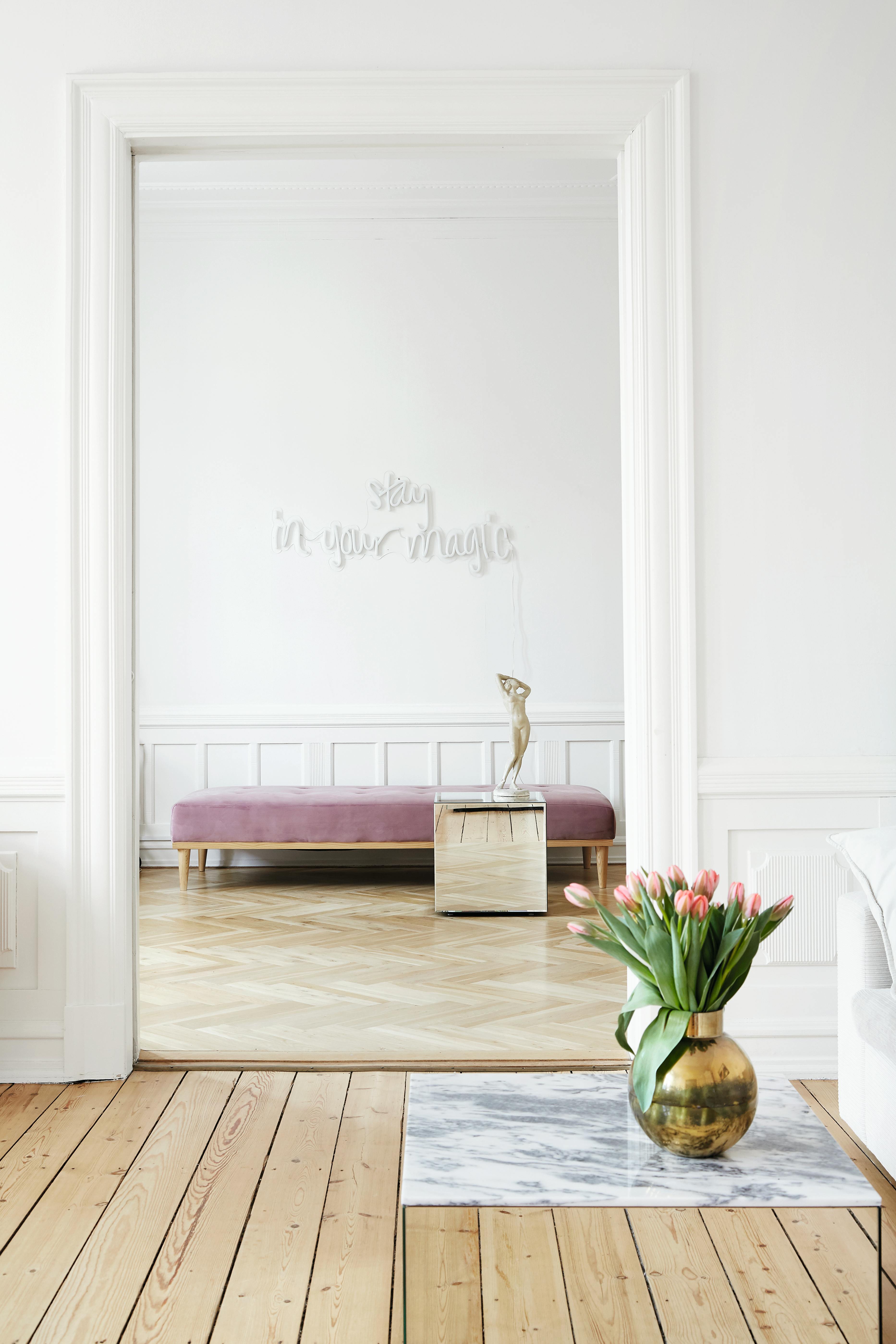 BILDE Daybedden er fra Sinnerup og speilbordet fra Zara Home. Sidsel kom over skulpturen i en butikk i København for mange år siden. Neonskiltet på veggen er kjøpt på Neonskiltet.dk og Sidsel har selv tilpasset teksten. Sofabordet i forgrunnen er fra Kristina Dam Studio og messingvasen fra H&M Home.