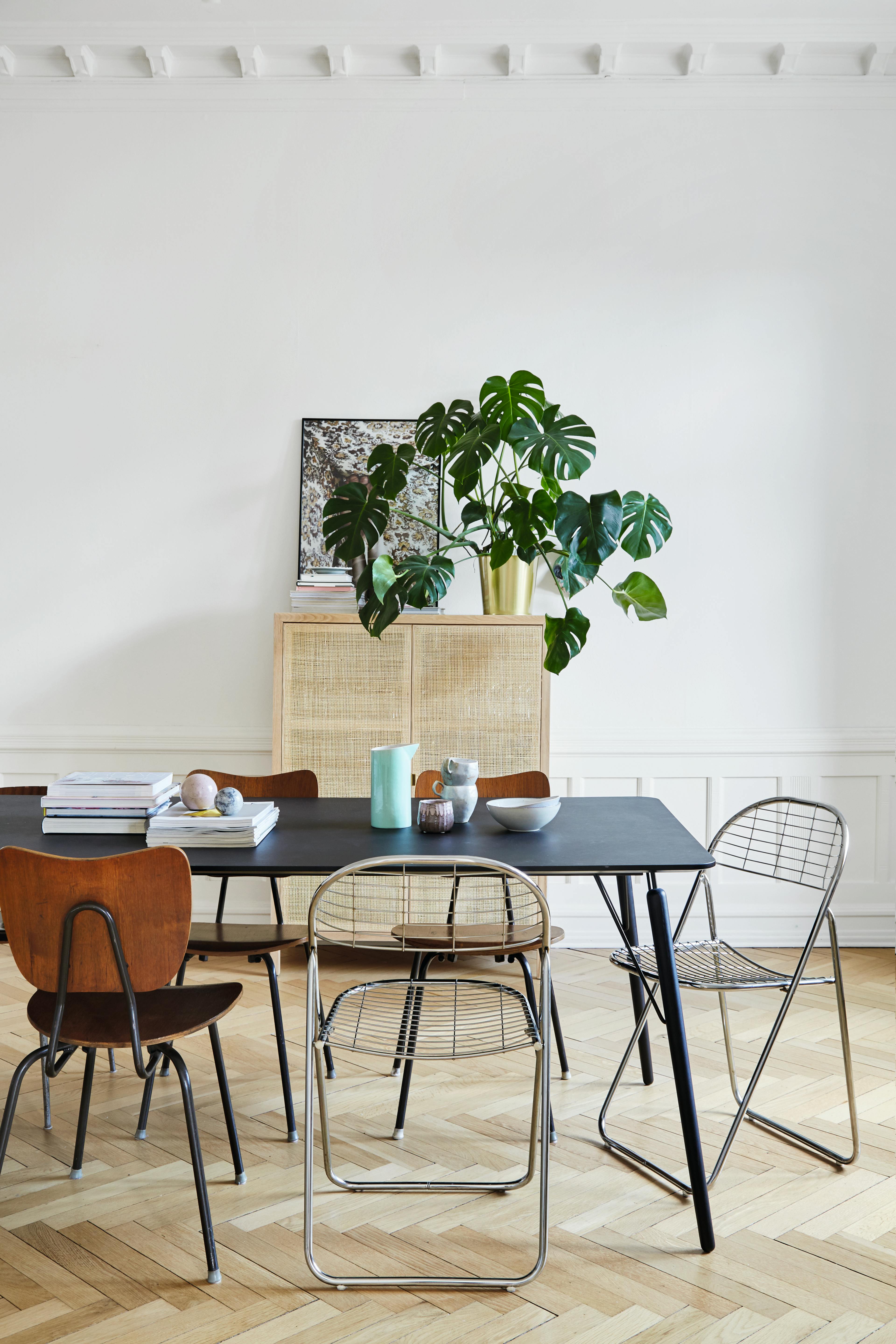 Spisebordet er fra Ilva, mens både de gamle skolestolene i teak og stålstolene er funnet brukt på nettet og på loppemarkeder. På bordet står keramikk av Marie Langaa og Bjarni Sigurdsen sammen med marmorkuler fra Søstrene Grene.