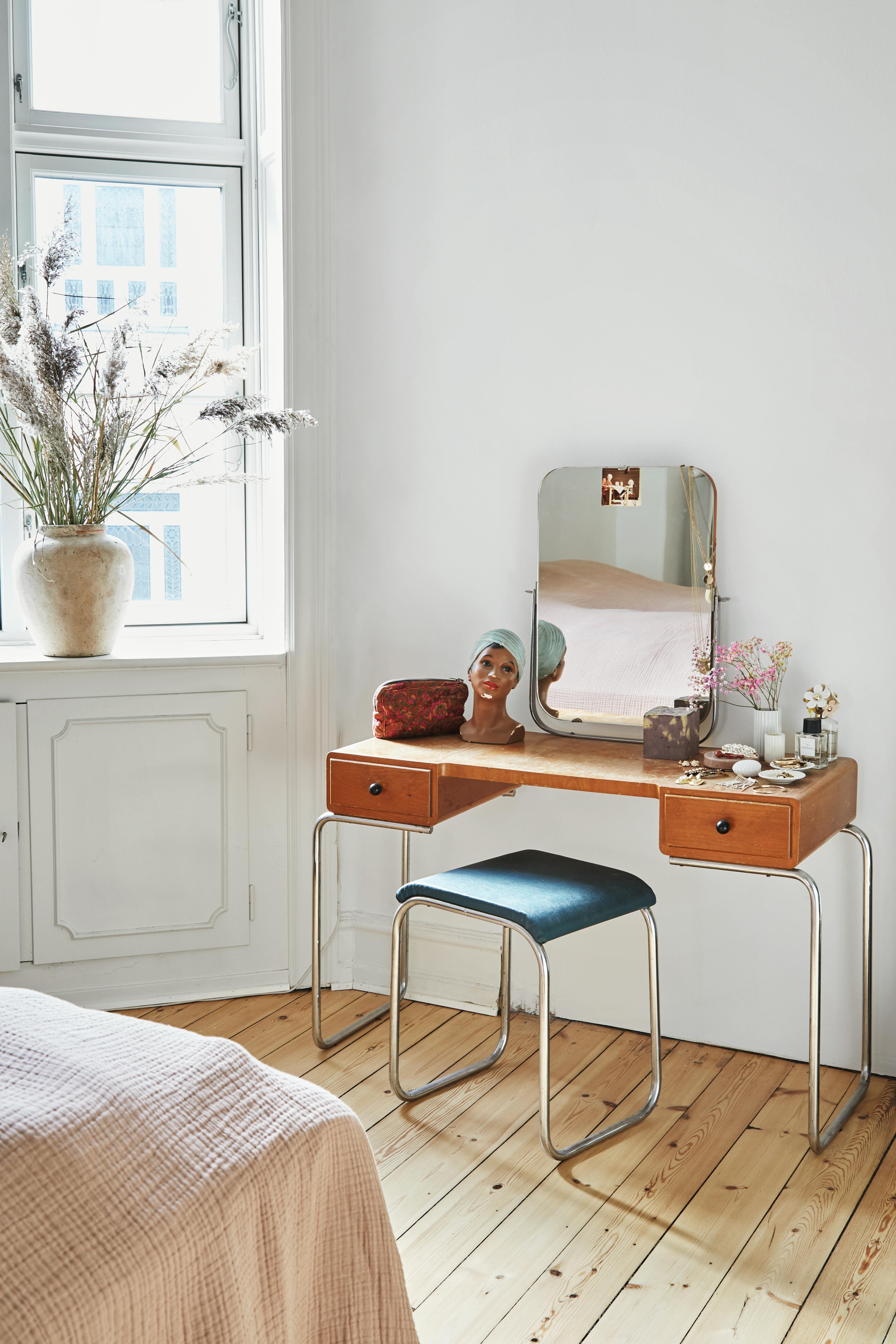 BILDE Sidsel overtok sminkebordet og krakken fra en venninne som skulle kvitte seg med dem. Bysten stammer fra et loppemarked, makeup-pungen er fra Ellies & Evy og krukken i vinduet er fra Rabens Saloner. De fine sivene i krukken er plukket ved familien sommerhytte.