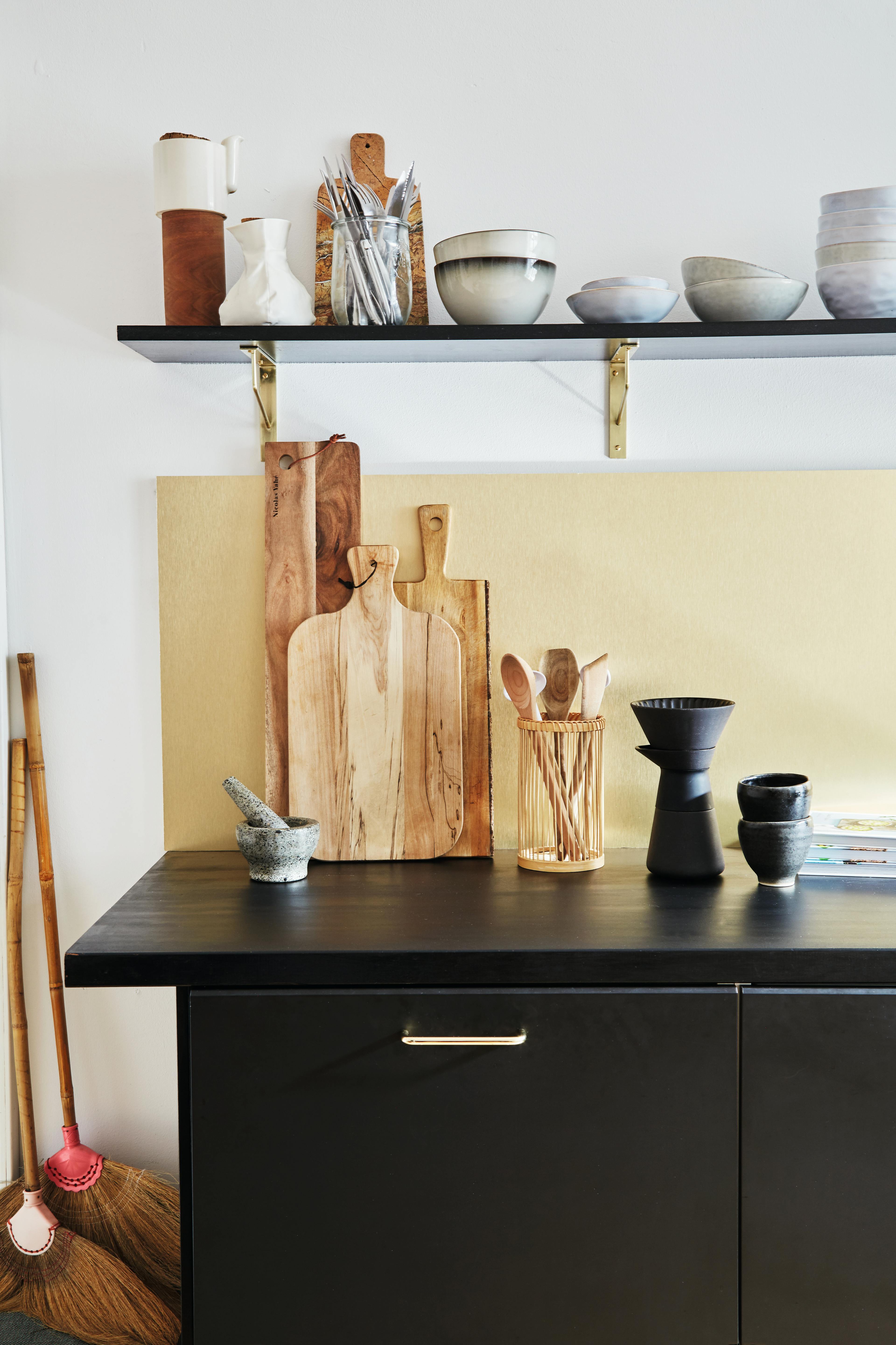 Ikea-kjøkkenet var i leiligheten da de flyttet inn, men de skiftet ut frontene og malte den massive benkeplaten svart. På benken står en morter fra Thailand og en kaffebrygger fra Stelton sammen med islandsk keramikk og en blanding av skjærefjøler og kjøkkenredskaper fra bl.a. Nicolas Vahé og Søstrene Grene.