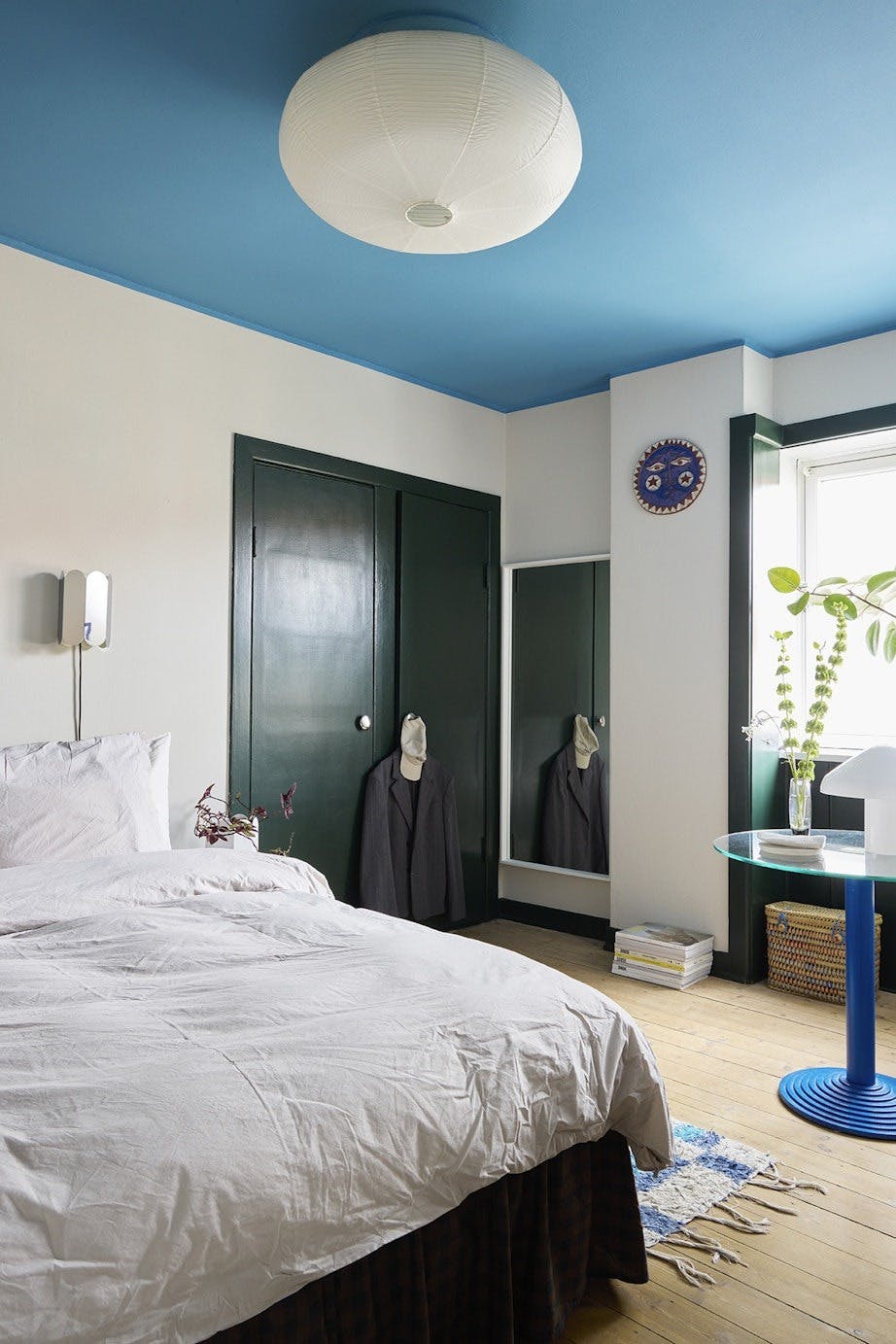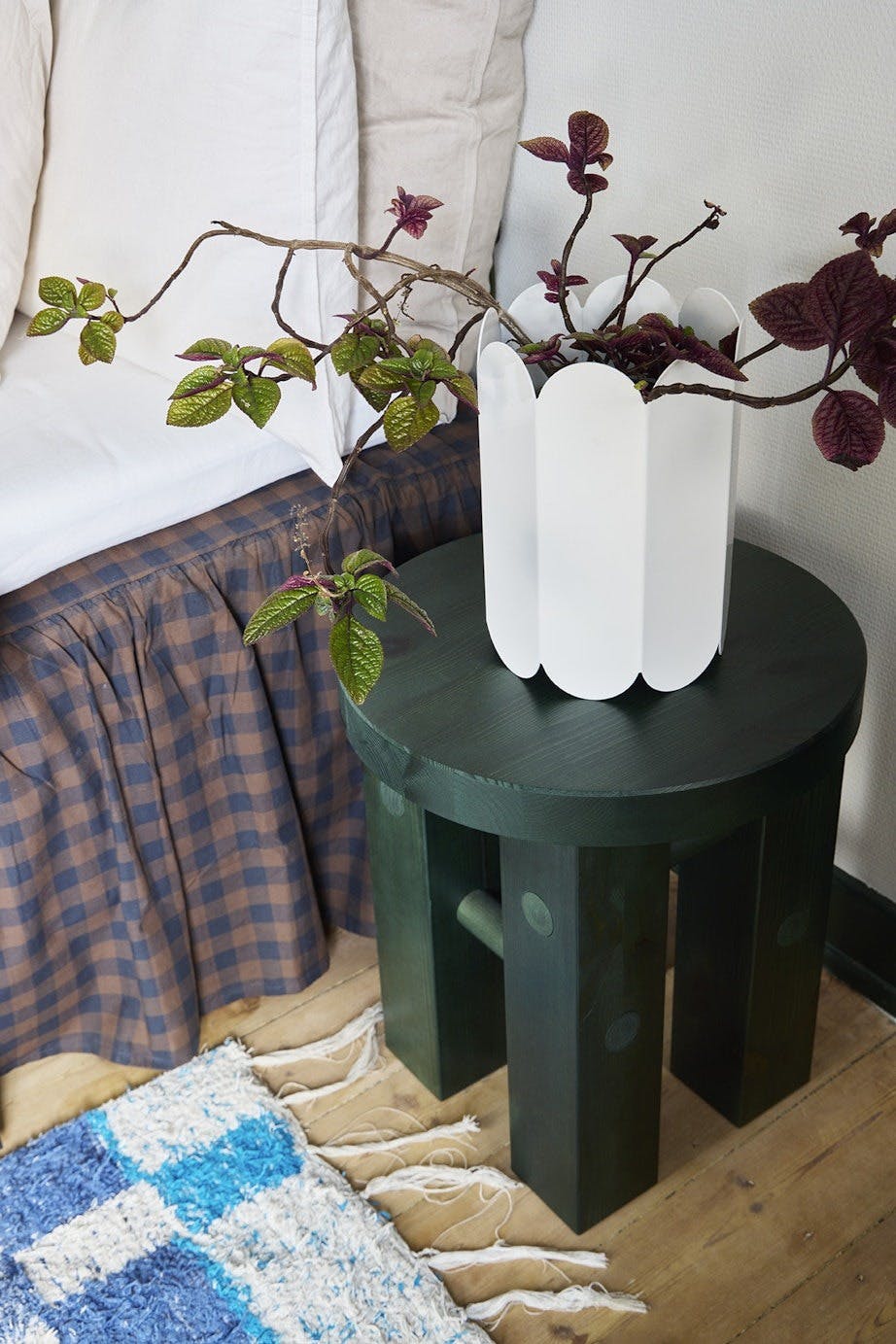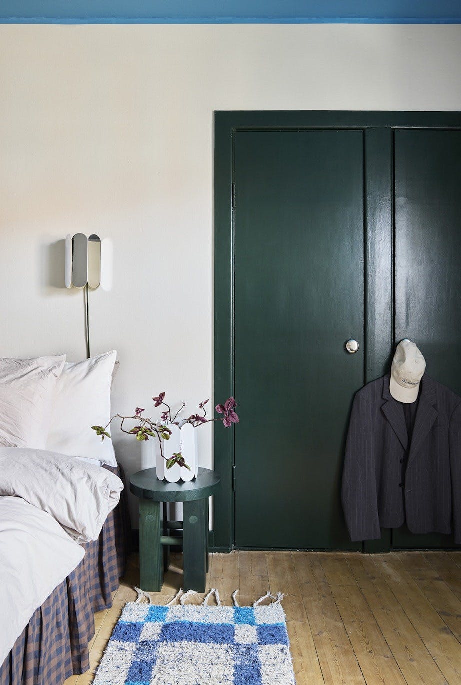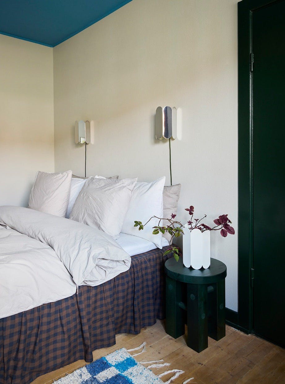 Mads elsker det nordvendte soverommet. Skapdørene er malt i en dypgrønn farge som matcher krakken fra Normann Copenhagen. Vegglampen og vasen er fra Hay X Muller Van Severen, mens det rutete kappe lakenet er fra Jotex og gulvmatten er kjøpt i Spania.