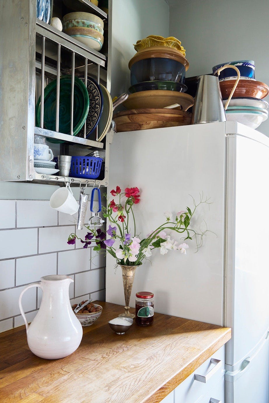 Kjøkkenet viser virkelig Mads’ forkjærlighet for vintage. Stålhyllen med tallerkener er fra Hay, den hvite muggen er kjøpt på et marked i Paris og den lille sølvvasen er et vintagefunn.