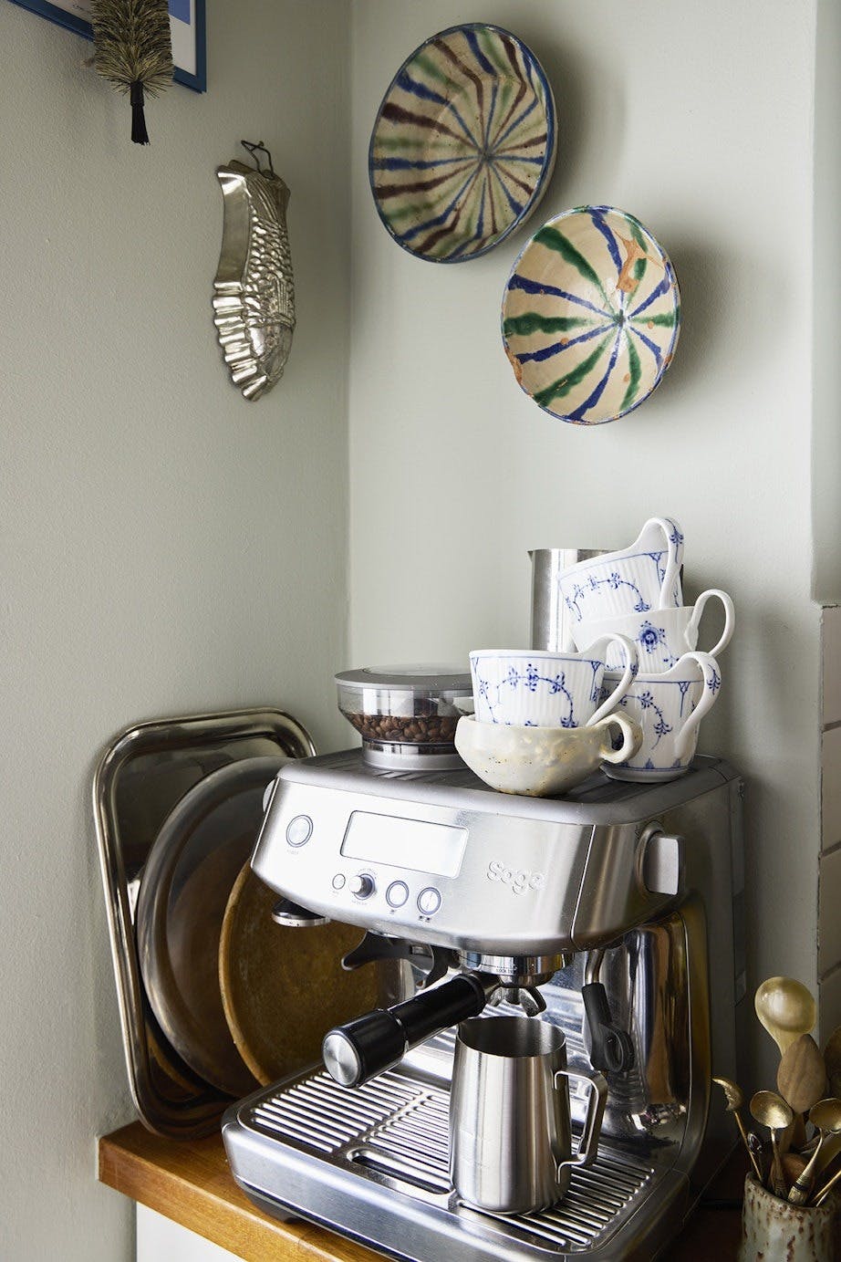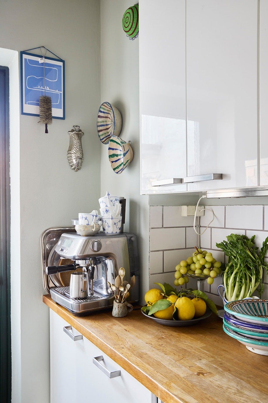 Fisken på veggen er kjøpt i en antikvitetsforretning, mens skålene er antikke reisefunn. Koppene på kaffemaskinen er fra Royal Copenhagen og Bjarni Sigurðsson.