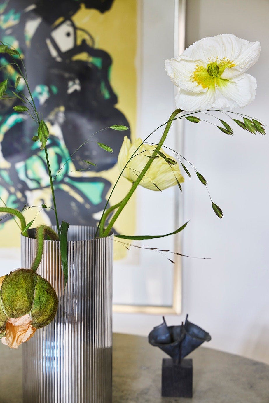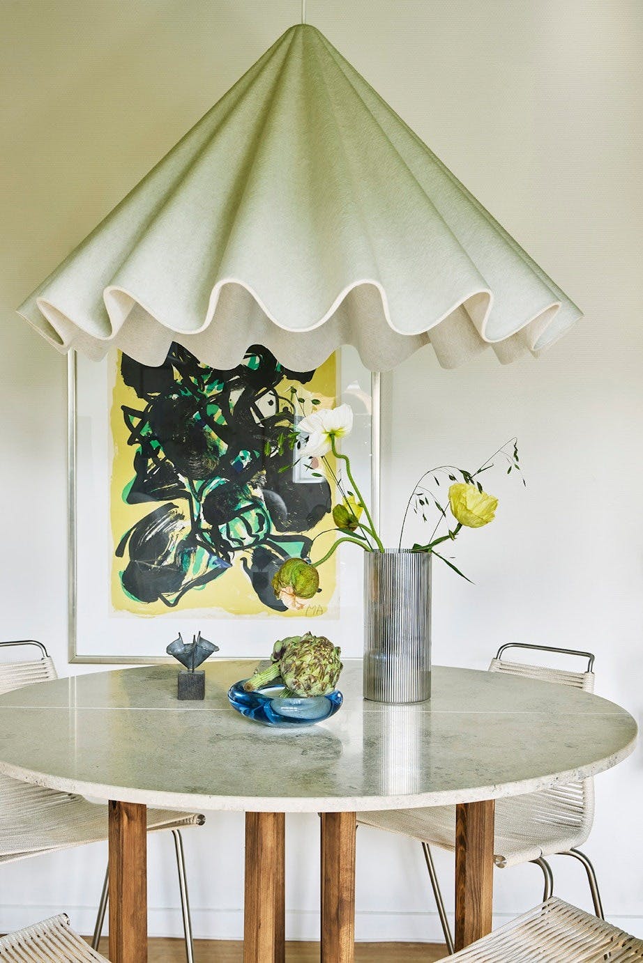 På veggen henger en Asger Jorn-litografi og en antikk, nederlandsk skål. Bordet er Poul Kjærholms PK 61, skålen er fra Georg Jensen og bordlampen fra Hay, mens vasen er Tage Andersens foldevase.
