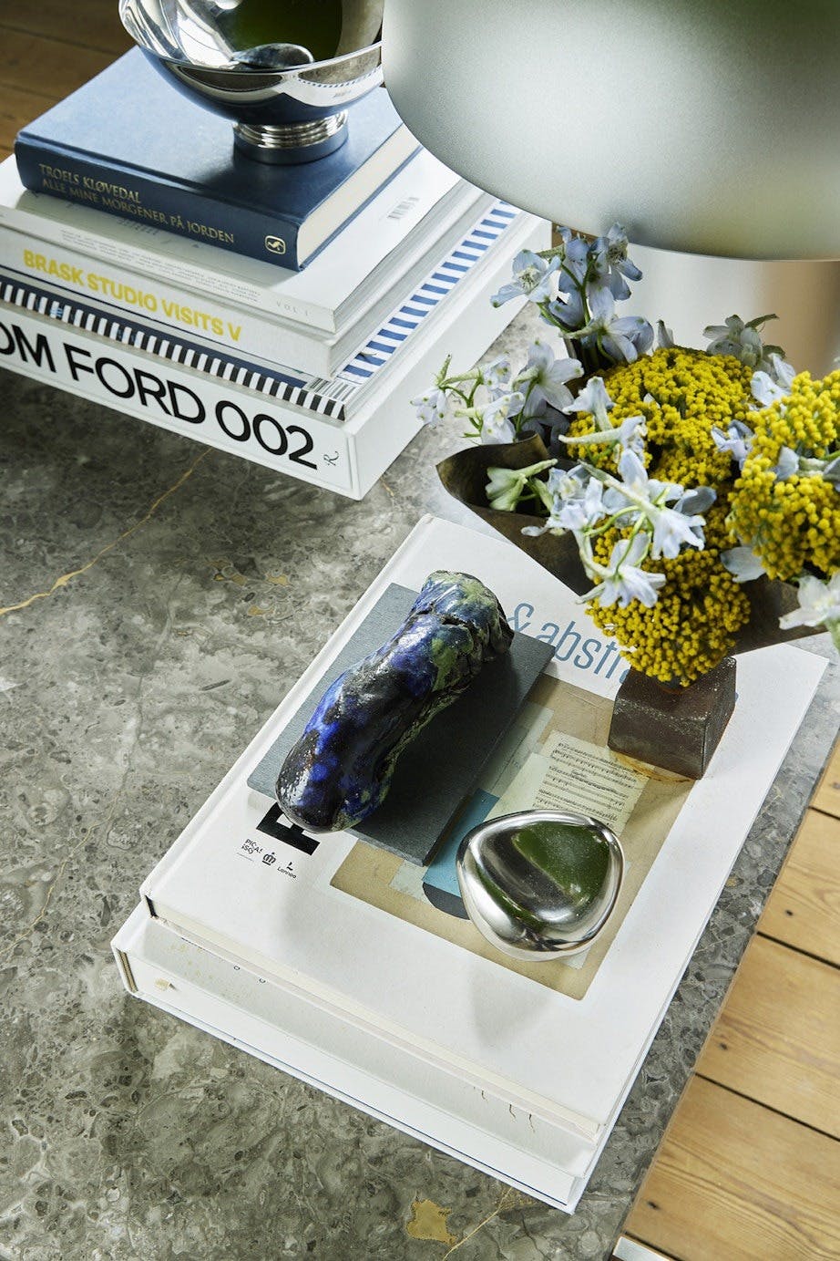 Mads har stylet sofabordet med bøker og organiske objekter. Keramikkfiguren er lagd av en tysk kunstner, mens miniskålen i krom er fra Ferm Living.