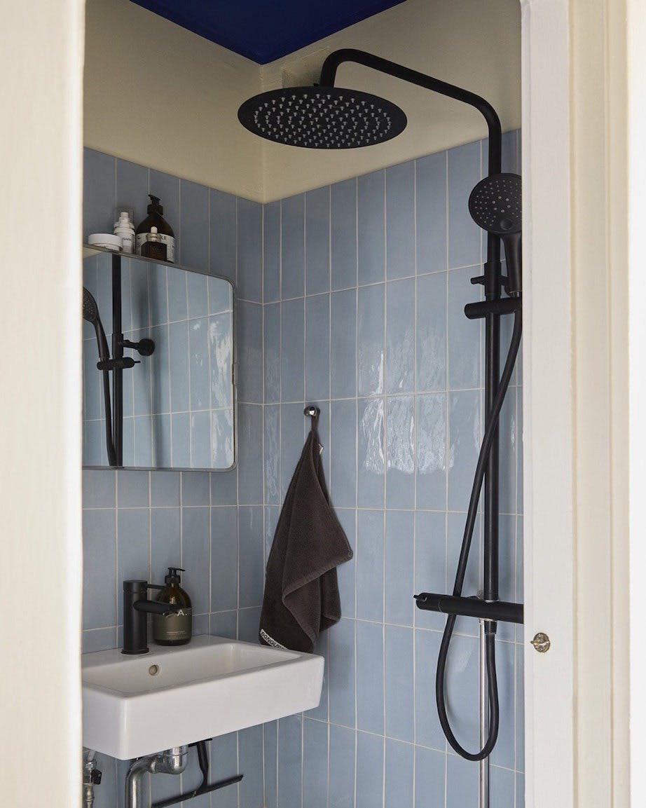 Mads pusset opp badet under pandemien, og også her fikk taket en fin farge. Speilskapet er et bruktfunn fra 60-tallet, mens de lyseblå flisene er fra Pissano.