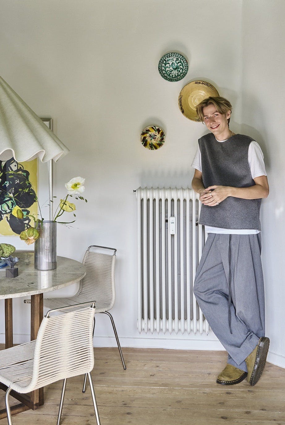 – Stilen min er sammensatt, og jeg mener bestemt at et hjem må utvikle seg over tid hvis det skal fortelle noe ekte om menneskene som bor der. Hos meg finnes både arvegods, ting jeg har hatt siden jeg flyttet hjemmefra og nyere funn. Jeg liker møtet mellom gammelt og nytt, det slitne og det rene, stramme. Det skaper stemning. Og kontrastene er tydelige – og helt bevisste – i innredningen hans.