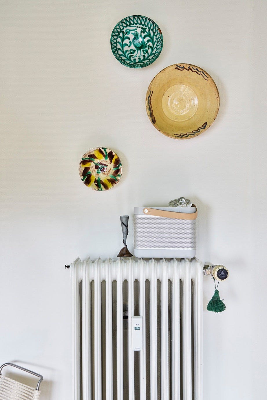 Tallerkener og skåler er flott på en lys vegg. Har du ikke noen i skapet, er det bare å stikke innom en bruktbutikk. Se etter noen med sterke farger og fine mønstre.